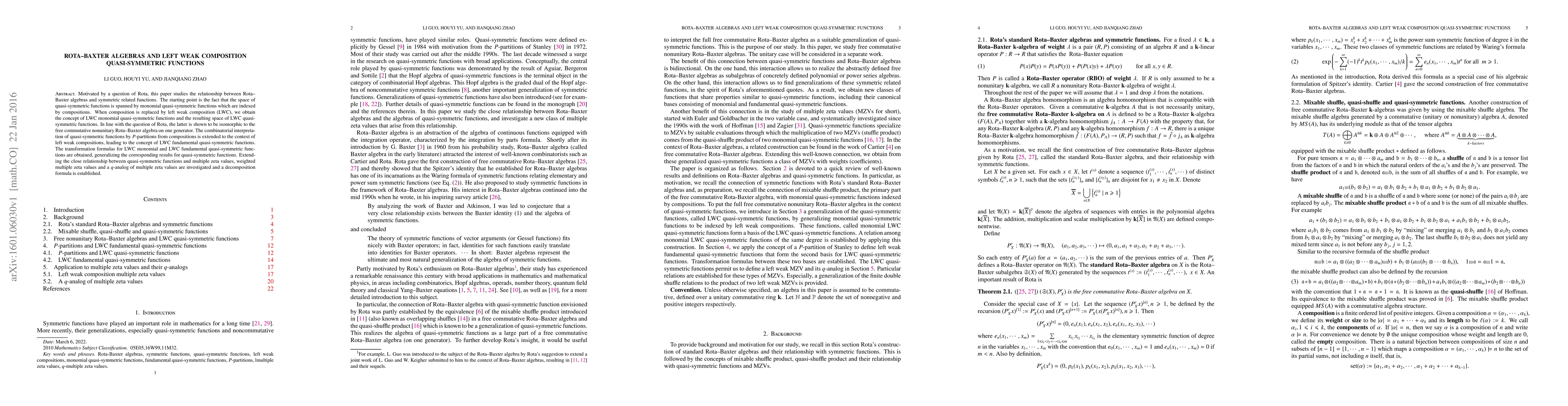 Motivated by a question of Rota, this paper studies the relationship between Rota--Baxter algebras and symmetric related functions. The starting point is the fact that the space of quasi-symmetric functions is spanned by monomial quasi-symmetric functions which are indexed by compositions. When composition is replaced by left weak composition (LWC), we obtain the concept of LWC monomial quasi-symmetric functions and the resulting space of LWC quasi-symmetric functions. In line with the question of Rota, the latter is shown to be isomorphic to the free commutative nonunitary Rota--Baxter algebra on one generator. The combinatorial interpretation of quasi-symmetric functions by $P$-partitions from compositions is extended to the context of left weak compositions, leading to the concept of LWC fundamental quasi-symmetric functions. The transformation formulas for LWC monomial and LWC fundamental quasi-symmetric functions are obtained, generalizing the corresponding results for quasi-symmetric functions. Extending the close relationship between quasi-symmetric functions and multiple zeta values, weighted multiple zeta values and a $q$-analog of multiple zeta values are investigated and a decomposition formula is established.