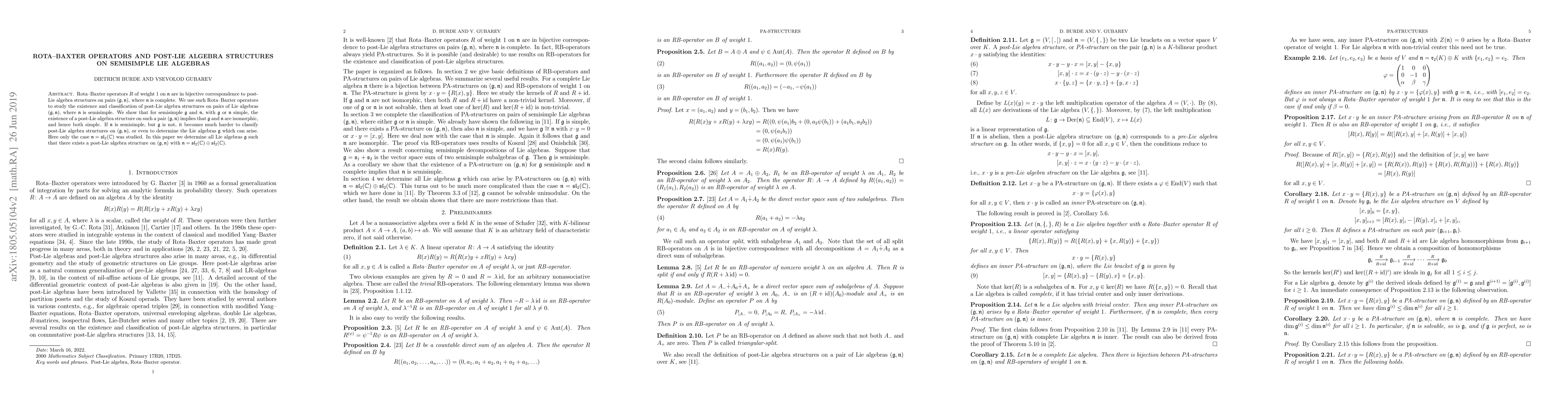Rota--Baxter operators $R$ of weight $1$ on $\mathfrak{n}$ are in bijective correspondence to post-Lie algebra structures on pairs $(\mathfrak{g},\mathfrak{n})$, where $\mathfrak{n}$ is complete. We use such Rota--Baxter operators to study the existence and classification of post-Lie algebra structures on pairs of Lie algebras $(\mathfrak{g},\mathfrak{n})$, where $\mathfrak{n}$ is semisimple. We show that for semisimple $\mathfrak{g}$ and $\mathfrak{n}$, with $\mathfrak{g}$ or $\mathfrak{n}$ simple, the existence of a post-Lie algebra structure on such a pair $(\mathfrak{g},\mathfrak{n})$ implies that $\mathfrak{g}$ and $\mathfrak{n}$ are isomorphic, and hence both simple. If $\mathfrak{n}$ is semisimple, but $\mathfrak{g}$ is not, it becomes much harder to classify post-Lie algebra structures on $(\mathfrak{g},\mathfrak{n})$, or even to determine the Lie algebras $\mathfrak{g}$ which can arise. Here only the case $\mathfrak{n}=\mathfrak{sl}_2(\Bbb{C})$ was studied. In this paper we determine all Lie algebras $\mathfrak{g}$ such that there exists a post-Lie algebra structure on $(\mathfrak{g},\mathfrak{n})$ with $\mathfrak{n}=\mathfrak{sl}_2(\Bbb{C})\oplus \mathfrak{sl}_2(\Bbb{C})$.