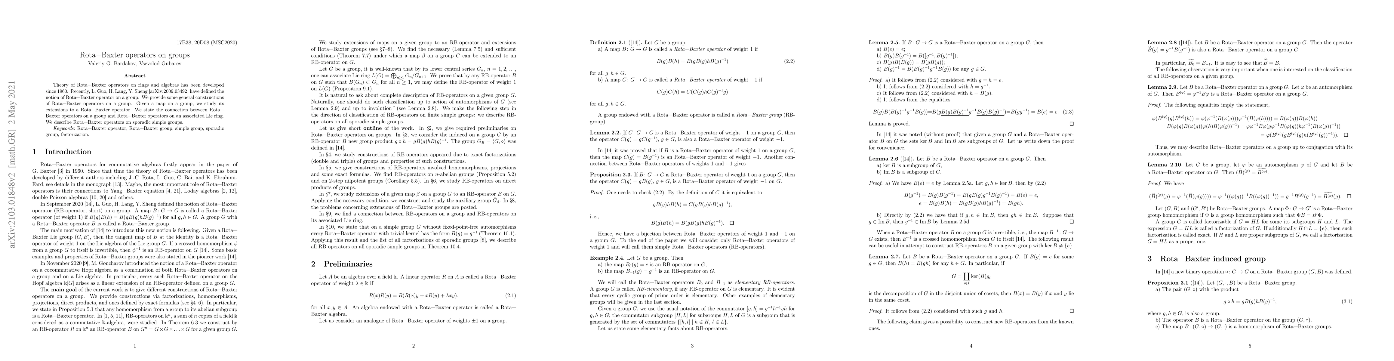 This paper explores the extension of Rota-Baxter operators, originally defined for rings and algebras, to groups, establishing constructions and connections to associated Lie rings. It also examines Rota-Baxter operators on sporadic simple groups.