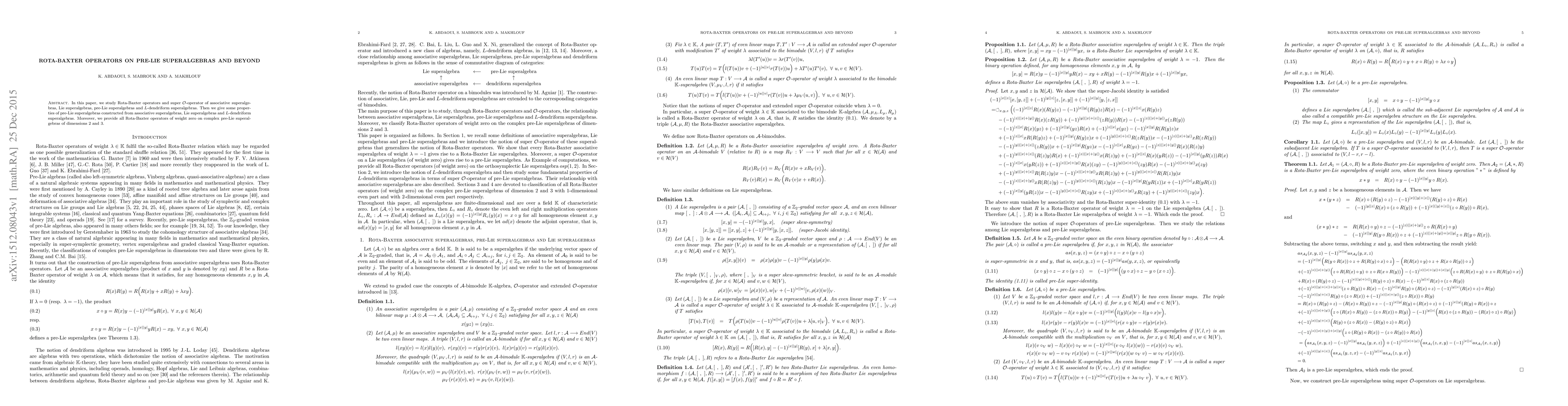 This paper investigates Rota-Baxter operators and super $\mathcal{O}$-operators in associative, Lie, pre-Lie, and $L$-dendriform superalgebras, focusing on properties of pre-Lie superalgebras derived from other structures, and identifies all Rota-Baxter operators of weight zero in complex pre-Lie superalgebras of dimensions $2$ and $3$.