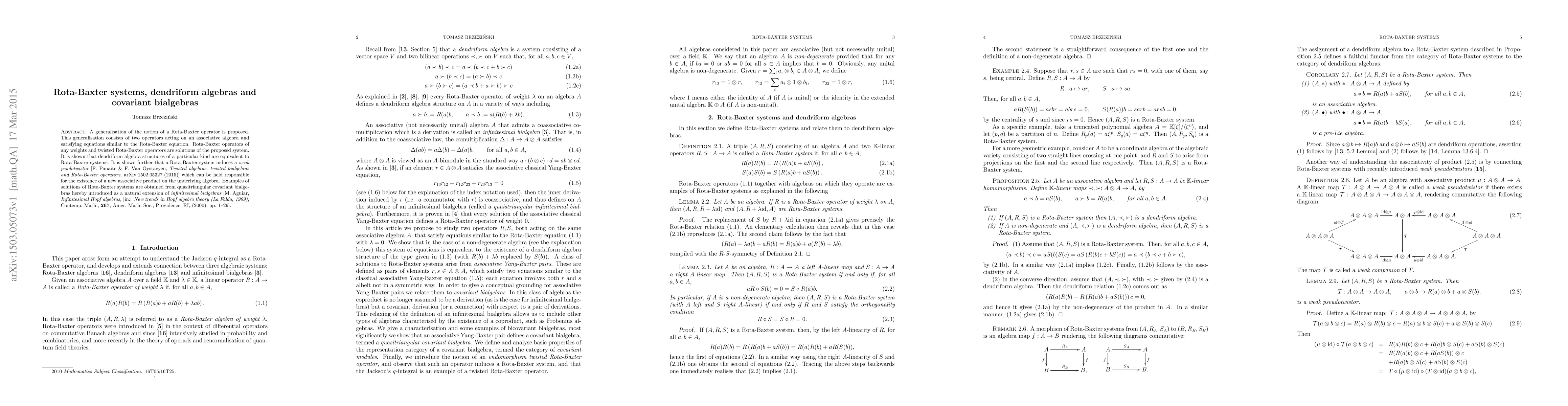 A generalisation of the notion of a Rota-Baxter operator is proposed. This generalisation consists of two operators acting on an associative algebra and satisfying equations similar to the Rota-Baxter equation. Rota-Baxter operators of any weights and twisted Rota-Baxter operators are solutions of the proposed system. It is shown that dendriform algebra structures of a particular kind are equivalent to Rota-Baxter systems. It is shown further that a Rota-Baxter system induces a weak peudotwistor [F. Panaite & F. Van Oystaeyen, Twisted algebras, twisted bialgebras and Rota-Baxter operators, arXiv:1502.05327 (2015)] which can be held responsible for the existence of a new associative product on the underlying algebra. Examples of solutions of Rota-Baxter systems are obtained from quasitriangular covariant bialgebras hereby introduced as a natural extension of infinitesimal bialgebras [M. Aguiar, Infinitesimal Hopf algebras, [in:] New trends in Hopf algebra theory (La Falda, 1999), Contemp. Math., 267, Amer. Math. Soc., Providence, RI, (2000), pp. 1-29].