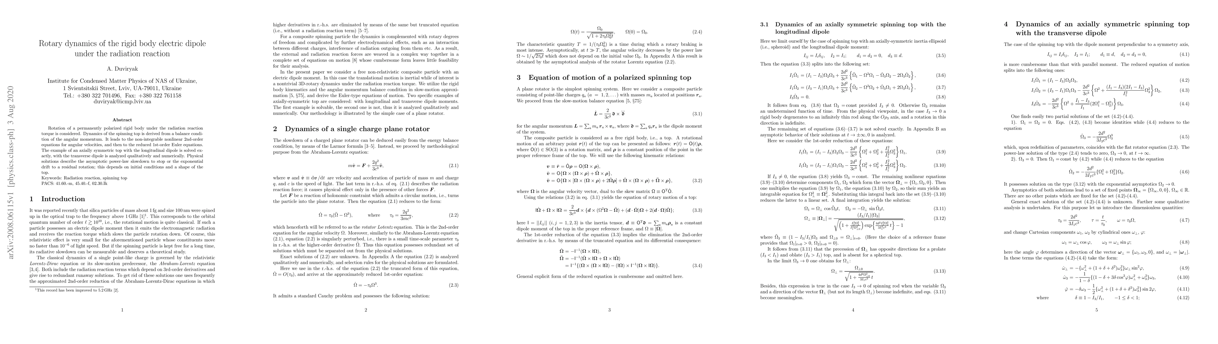 This paper derives the rotary dynamics of a rigid body electric dipole under radiation reaction, presenting exact solutions for an axially symmetric top and qualitative/numerical analysis for a top with a transverse dipole. Physical solutions describe either a power-law slowdown to stop or exponential drift to residual rotation, dependent on initial conditions and top shape.