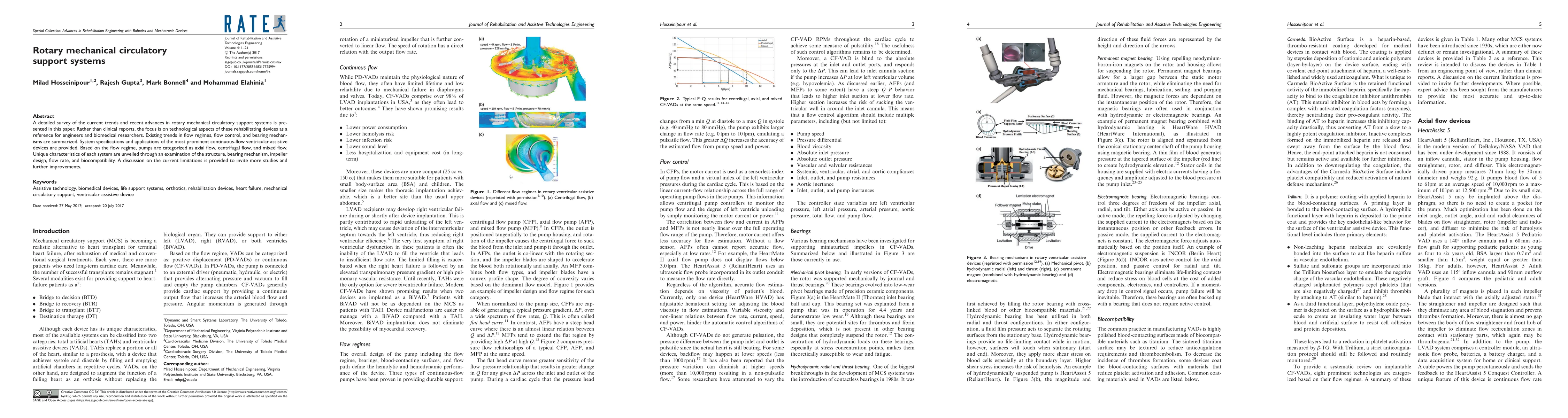 A detailed survey of the current trends and recent advances in rotary mechanical circulatory support systems is presented in this paper. Rather than clinical reports, the focus is on technological aspects of these rehabilitating devices as a reference for engineers and biomedical researchers. Existing trends in flow regimes, flow control, and bearing mechanisms are summarized. System specifications and applications of the most prominent continuous-flow ventricular assistive devices are provided. Based on the flow regime, pumps are categorized as axial flow, centrifugal flow, and mixed flow. Unique characteristics of each system are unveiled through an examination of the structure, bearing mechanism, impeller design, flow rate, and biocompatibility. A discussion on the current limitations is provided to invite more studies and further improvements.