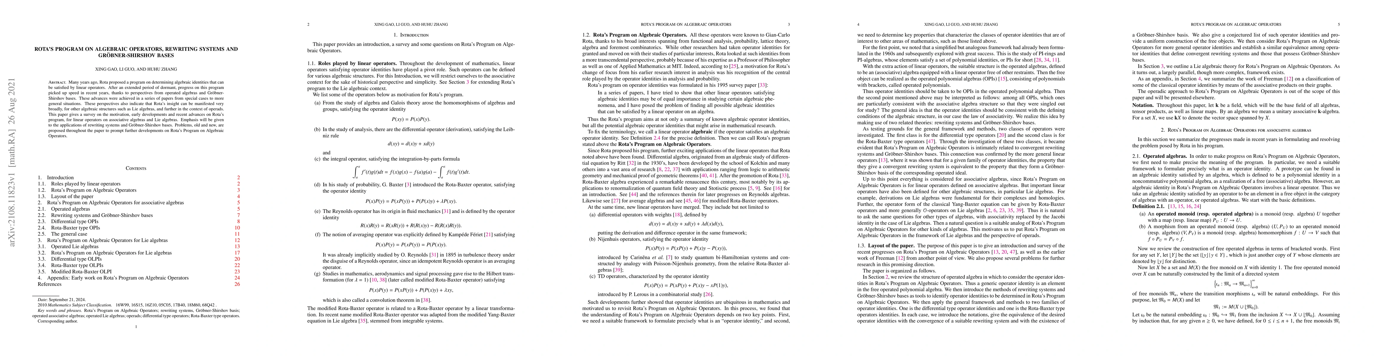 This paper surveys Rota's program on algebraic identities satisfied by linear operators, highlighting recent advances using Gr\"obner-Shirshov bases and rewriting systems, and proposes new problems to further its development in associative and Lie algebras.
