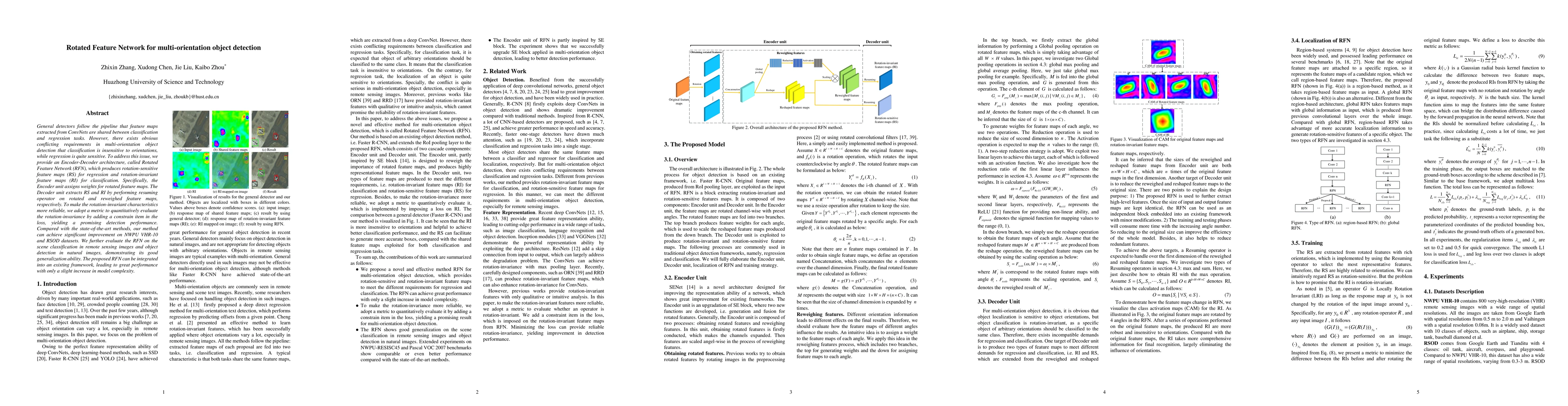 The Rotated Feature Network (RFN) addresses multi-orientation object detection by producing rotation-sensitive and rotation-invariant feature maps for regression and classification, respectively, leading to significant performance improvements on benchmark datasets. The RFN's integration into existing frameworks enhances detection with minimal complexity increase.