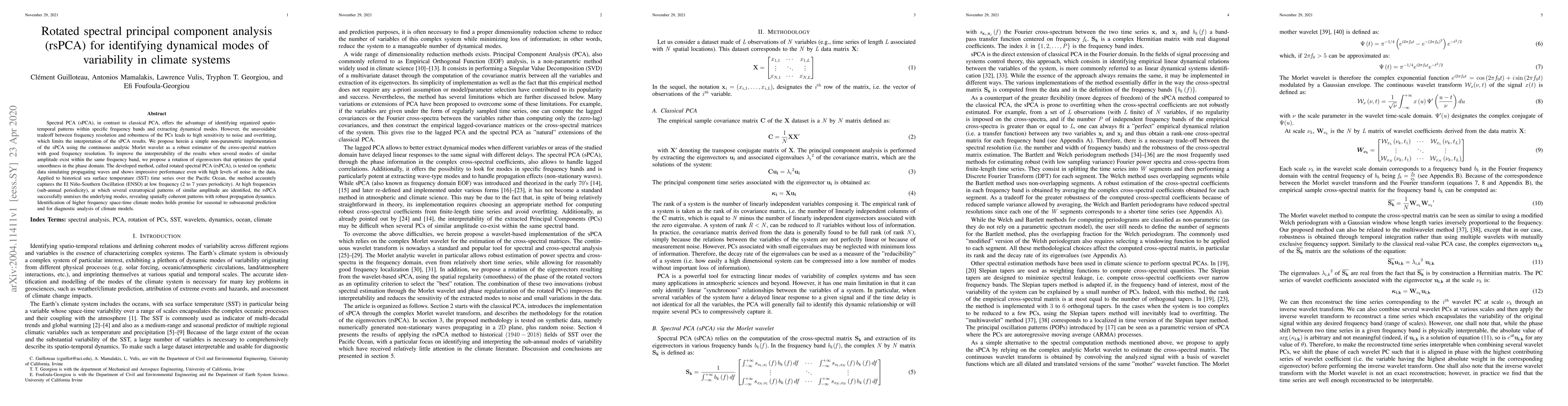 Spectral PCA (sPCA), in contrast to classical PCA, offers the advantage of identifying organized spatio-temporal patterns within specific frequency bands and extracting dynamical modes. However, the unavoidable tradeoff between frequency resolution and robustness of the PCs leads to high sensitivity to noise and overfitting, which limits the interpretation of the sPCA results. We propose herein a simple non-parametric implementation of the sPCA using the continuous analytic Morlet wavelet as a robust estimator of the cross-spectral matrices with good frequency resolution. To improve the interpretability of the results when several modes of similar amplitude exist within the same frequency band, we propose a rotation of eigenvectors that optimizes the spatial smoothness in the phase domain. The developed method, called rotated spectral PCA (rsPCA), is tested on synthetic data simulating propagating waves and shows impressive performance even with high levels of noise in the data. Applied to historical sea surface temperature (SST) time series over the Pacific Ocean, the method accurately captures the El Ni\~{n}o-Southern Oscillation (ENSO) at low frequency (2 to 7 years periodicity). At high frequencies (sub-annual periodicity), at which several extratropical patterns of similar amplitude are identified, the rsPCA successfully unmixes the underlying modes, revealing spatially coherent patterns with robust propagation dynamics. Identification of higher frequency space-time climate modes holds promise for seasonal to subseasonal prediction and for diagnostic analysis of climate models.