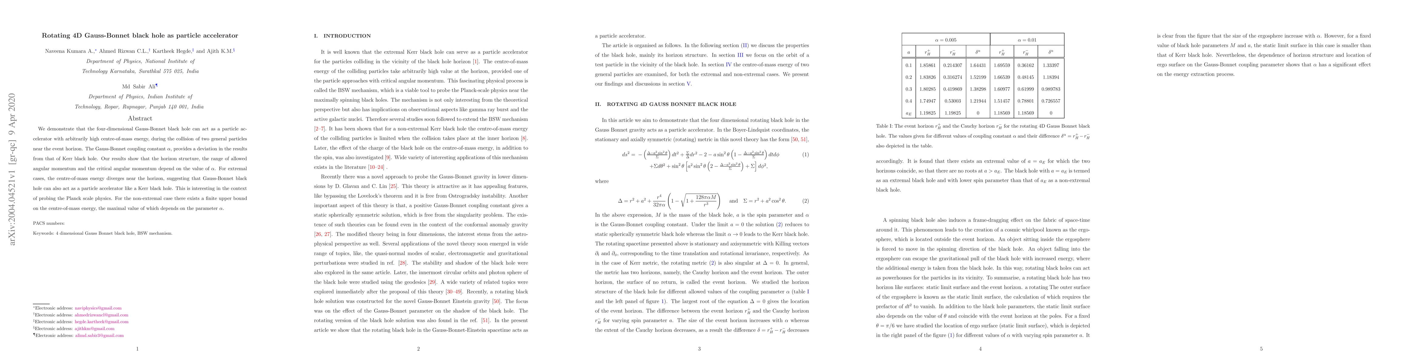 We demonstrate that the four-dimensional Gauss-Bonnet black hole can act as a particle accelerator with arbitrarily high centre-of-mass energy, during the collision of two general particles near the event horizon. The Gauss-Bonnet coupling constant $\alpha$, provides a deviation in the results from that of Kerr black hole. Our results show that the horizon structure, the range of allowed angular momentum and the critical angular momentum depend on the value of $\alpha$. For extremal cases, the centre-of-mass energy diverges near the horizon, suggesting that Gauss-Bonnet black hole can also act as a particle accelerator like a Kerr black hole. This is interesting in the context of probing the Planck scale physics. For the non-extremal case there exists a finite upper bound on the centre-of-mass energy, the maximal value of which depends on the parameter $\alpha$.