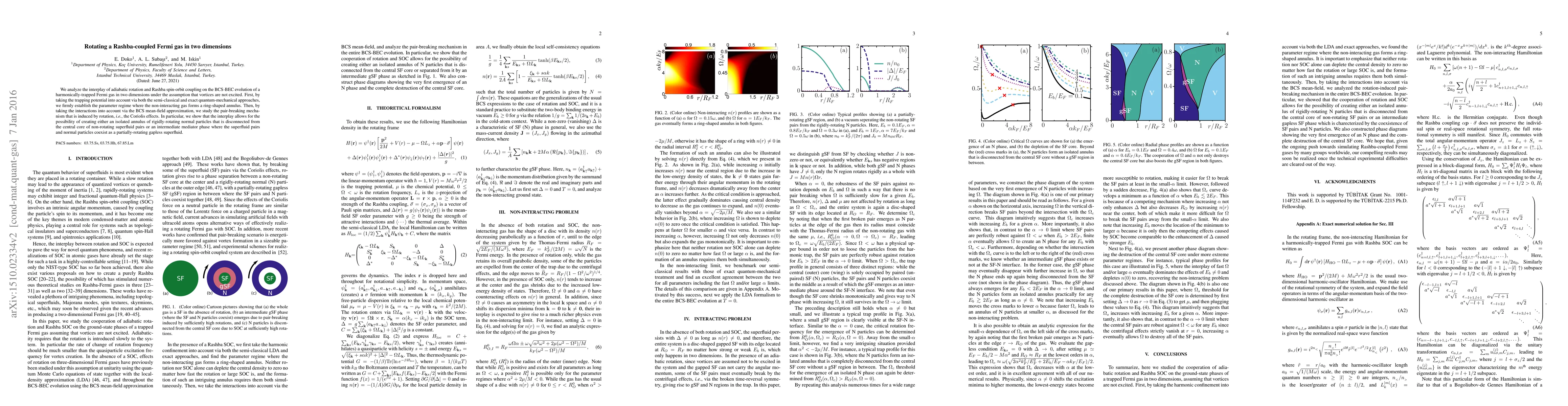 We analyze the interplay of adiabatic rotation and Rashba spin-orbit coupling on the BCS-BEC evolution of a harmonically-trapped Fermi gas in two dimensions under the assumption that vortices are not excited. First, by taking the trapping potential into account via both the semi-classical and exact quantum-mechanical approaches, we firmly establish the parameter regime where the non-interacting gas forms a ring-shaped annulus. Then, by taking the interactions into account via the BCS mean-field approximation, we study the pair-breaking mechanism that is induced by rotation, i.e., the Coriolis effects. In particular, we show that the interplay allows for the possibility of creating either an isolated annulus of rigidly-rotating normal particles that is disconnected from the central core of non-rotating superfluid pairs or an intermediate mediator phase where the superfluid pairs and normal particles coexist as a partially-rotating gapless superfluid.