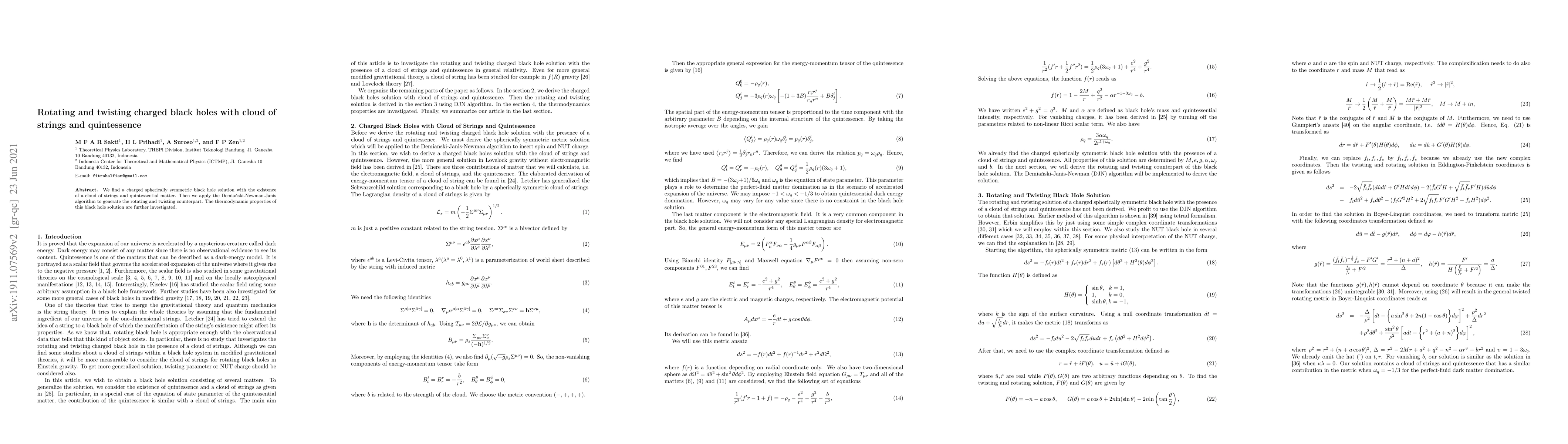 This paper presents a charged spherical black hole solution with strings and quintessence, then uses the Demianski-Newman-Janis algorithm to derive its rotating and twisting version. The study also explores the thermodynamic properties of this advanced black hole solution.