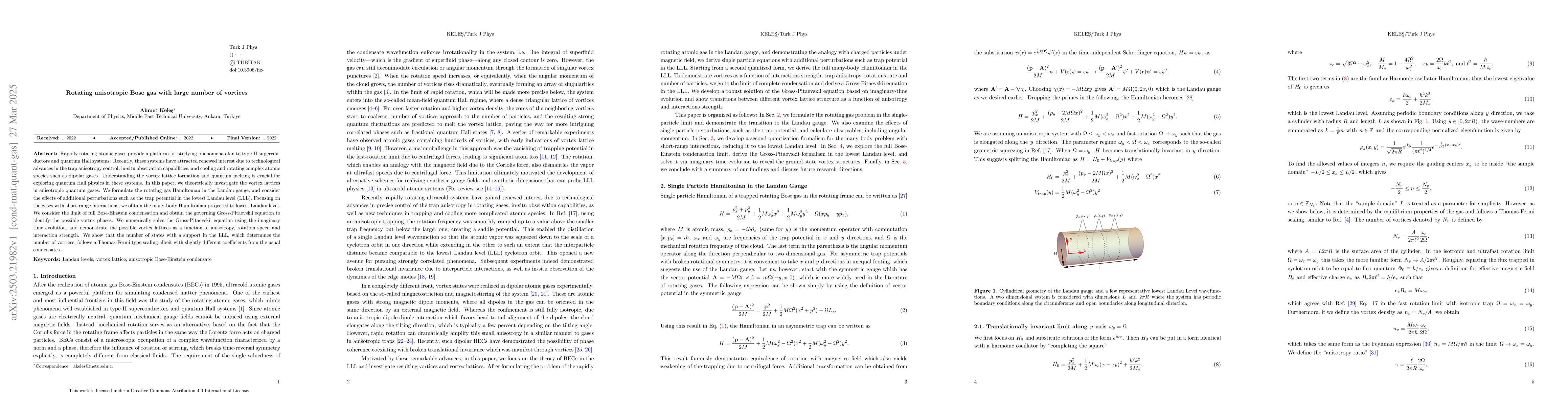 The research formulates a model for a rotating anisotropic Bose gas in the Landau gauge, considers additional perturbations like the trap potential in the lowest Landau level (LLL), and derives a many-body Hamiltonian projected to the LLL manifold for short-range interacting gases.