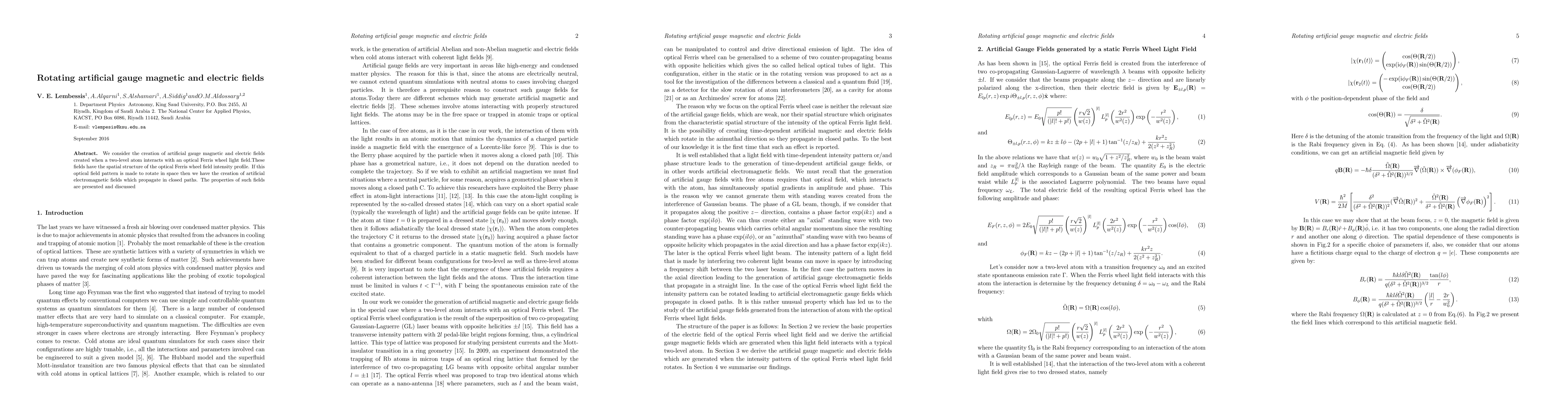 This paper explores the creation of artificial gauge magnetic and electric fields through the interaction of a two-level atom with a rotating optical Ferris wheel light field, resulting in electromagnetic fields that propagate in closed paths, with properties analyzed and discussed.