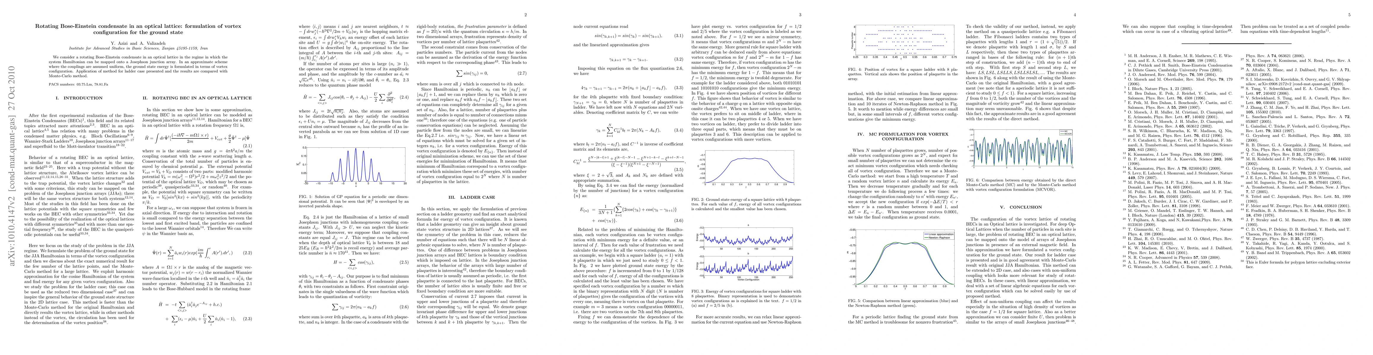 This paper formulates the ground state energy of a rotating Bose-Einstein condensate (BEC) in an optical lattice by mapping it to uniformly frustrated Josephson junction arrays, focusing on vortex configurations. The proposed method naturally yields a vortex lattice in the ground state, and its application to a ladder case is numerically compared with Monte-Carlo methods, while discussing limitations and suggesting improvements.