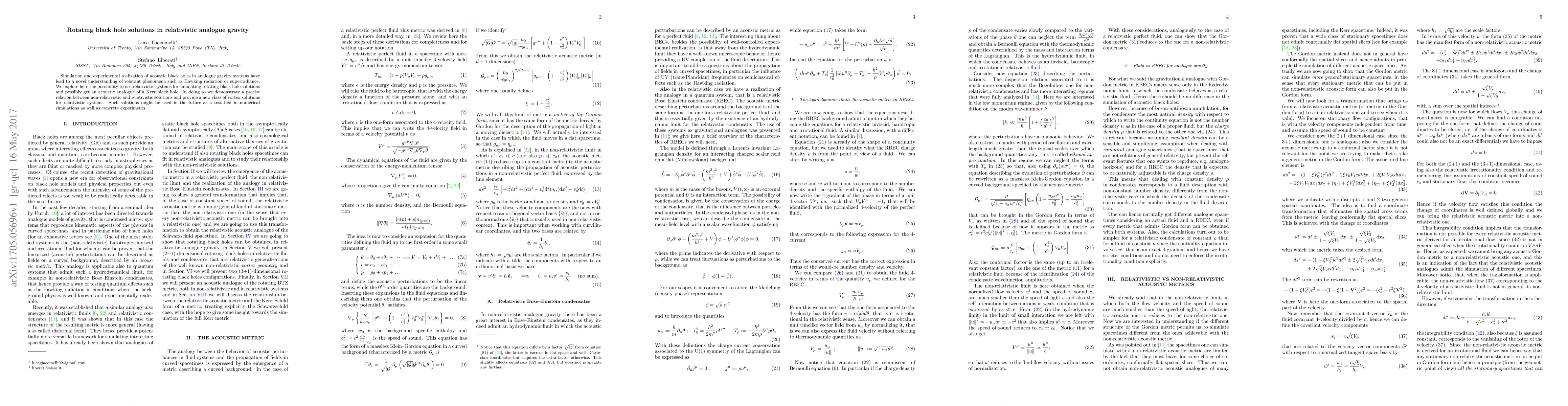 Simulation and experimental realization of acoustic black holes in analogue gravity systems have lead to a novel understanding of relevant phenomena such as Hawking radiation or superradiance. We explore here the possibility to use relativistic systems for simulating rotating black hole solutions and possibly get an acoustic analogue of a Kerr black hole. In doing so we demonstrate a precise relation between non-relativistic and relativistic solutions and provide a new class of vortex solutions for relativistic systems. Such solutions might be used in the future as a test bed in numerical simulations as well as concrete experiments.
