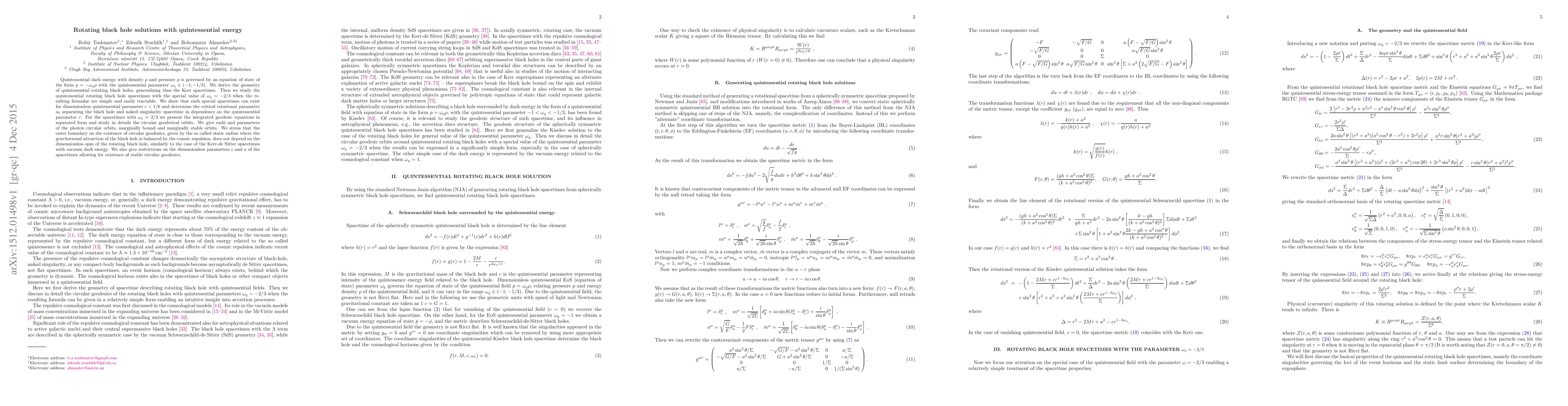 This paper explores quintessential rotating black hole solutions with a specific equation of state, deriving their geometry and analyzing their properties, particularly focusing on the case where $\omega_q = -2/3$. It determines critical parameters for the existence of these black holes and examines the behavior of geodesics, including photon orbits and stable circular orbits, noting similarities to Kerr-de Sitter spacetimes.