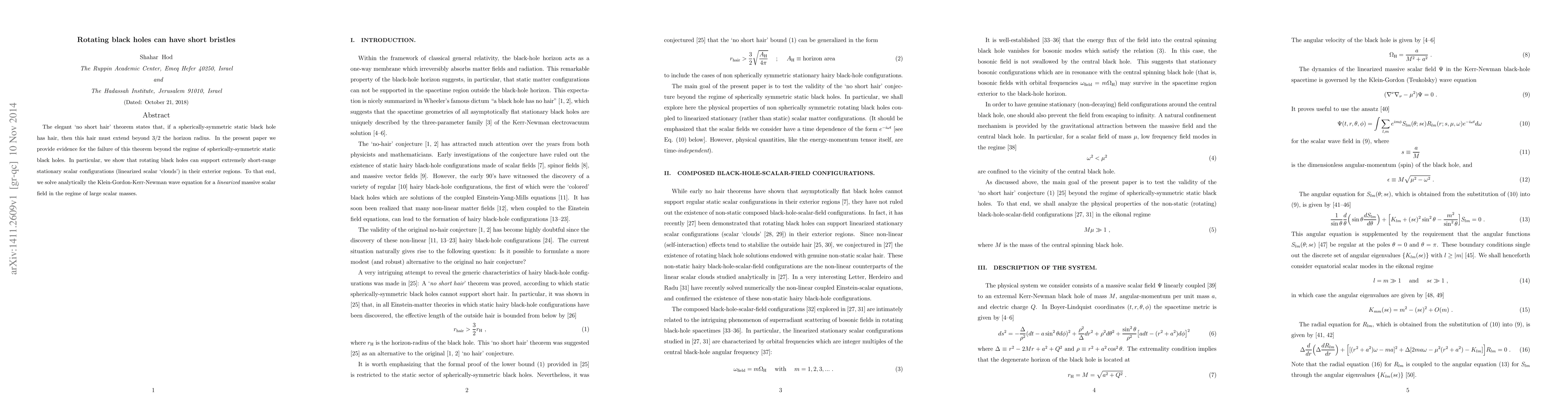This paper demonstrates that rotating black holes can possess short-range "clouds" of scalar fields, challenging the "no short hair" theorem which applies only to spherically-symmetric static black holes. The authors analytically solve the Klein-Gordon-Kerr-Newman equation for massive scalars to show this phenomenon.