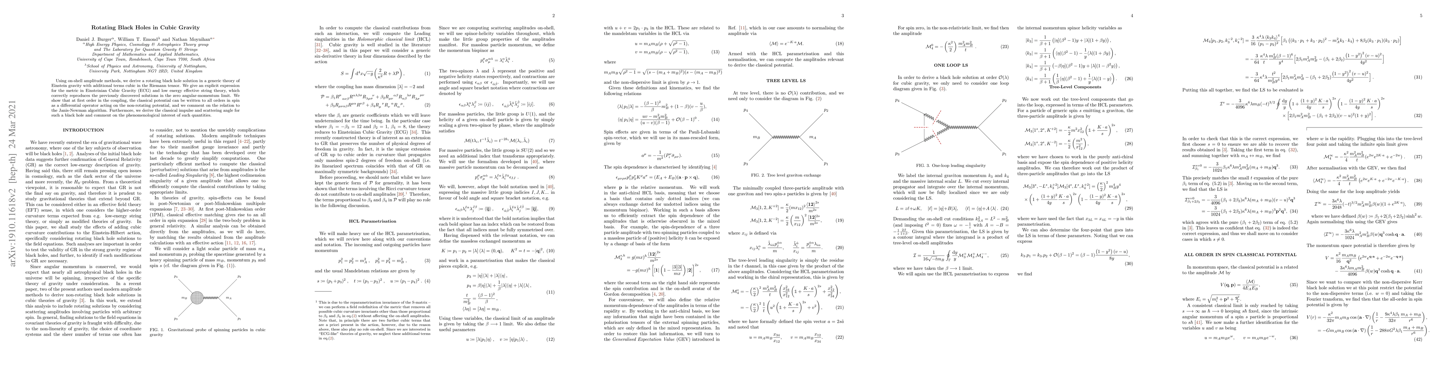 Using on-shell amplitude methods, we derive a rotating black hole solution in a generic theory of Einstein gravity with additional terms cubic in the Riemann tensor. We give an explicit expression for the metric in Einsteinian Cubic Gravity (ECG) and low energy effective string theory, which correctly reproduces the previously discovered solutions in the zero angular-momentum limit. We show that at first order in the coupling, the classical potential can be written to all orders in spin as a differential operator acting on the non-rotating potential, and we comment on the relation to the Janis-Newman algorithm. Furthermore, we derive the classical impulse and scattering angle for such a black hole and comment on the phenomenological interest of such quantities.