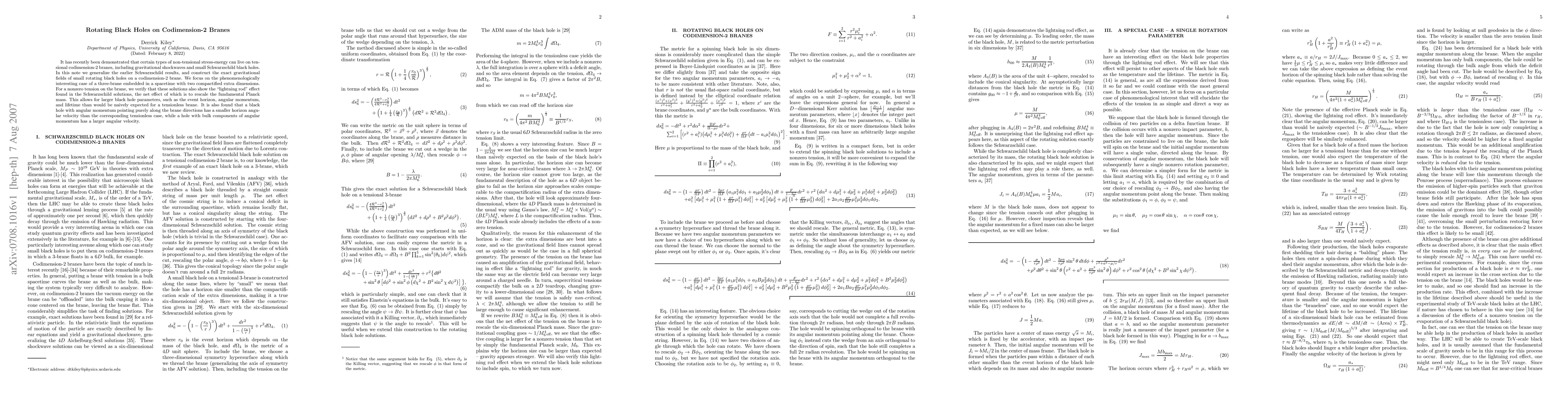 It has recently been demonstrated that certain types of non-tensional stress-energy can live on tensional codimension-2 branes, including gravitational shockwaves and small Schwarzschild black holes. In this note we generalize the earlier Schwarzschild results, and construct the exact gravitational fields of small rotating black holes on a codimension-2 brane. We focus on the phenomenologically interesting case of a three-brane embedded in a spacetime with two compactified extra dimensions. For a nonzero tension on the brane, we verify that these solutions also show the ``lightning rod'' effect found in the Schwarzschild solutions, the net effect of which is to rescale the fundamental Planck mass. This allows for larger black hole parameters, such as the event horizon, angular momentum, and lifetime than would be naively expected for a tensionless brane. It is also found that a black hole with angular momentum pointing purely along the brane directions has a smaller horizon angular velocity than the corresponding tensionless case, while a hole with bulk components of angular momentum has a larger angular velocity.