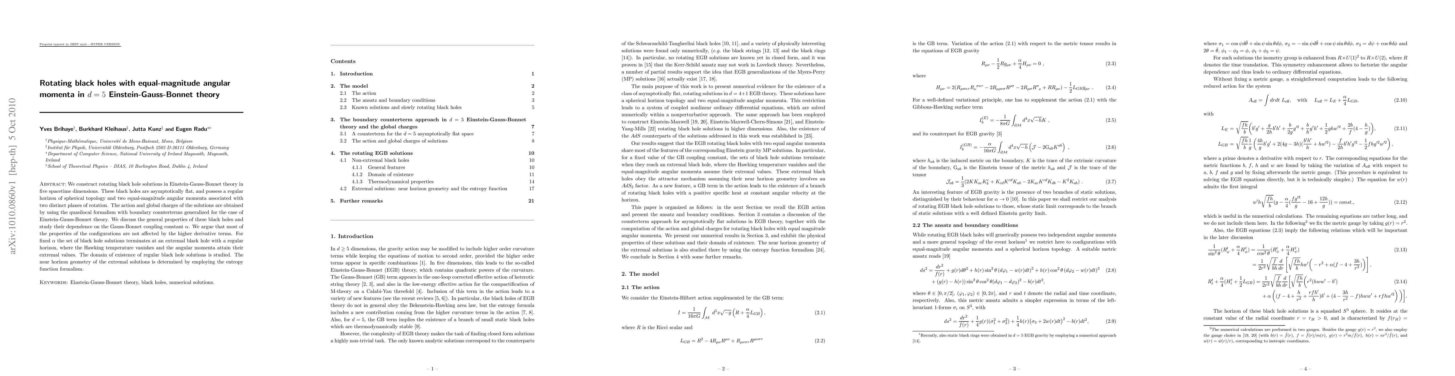 This paper constructs rotating black hole solutions in five-dimensional Einstein-Gauss-Bonnet theory with two equal-magnitude angular momenta. It examines the properties of these solutions, noting that higher derivative terms have minimal impact, and explores the domain of existence and near-horizon geometry of extremal black holes.