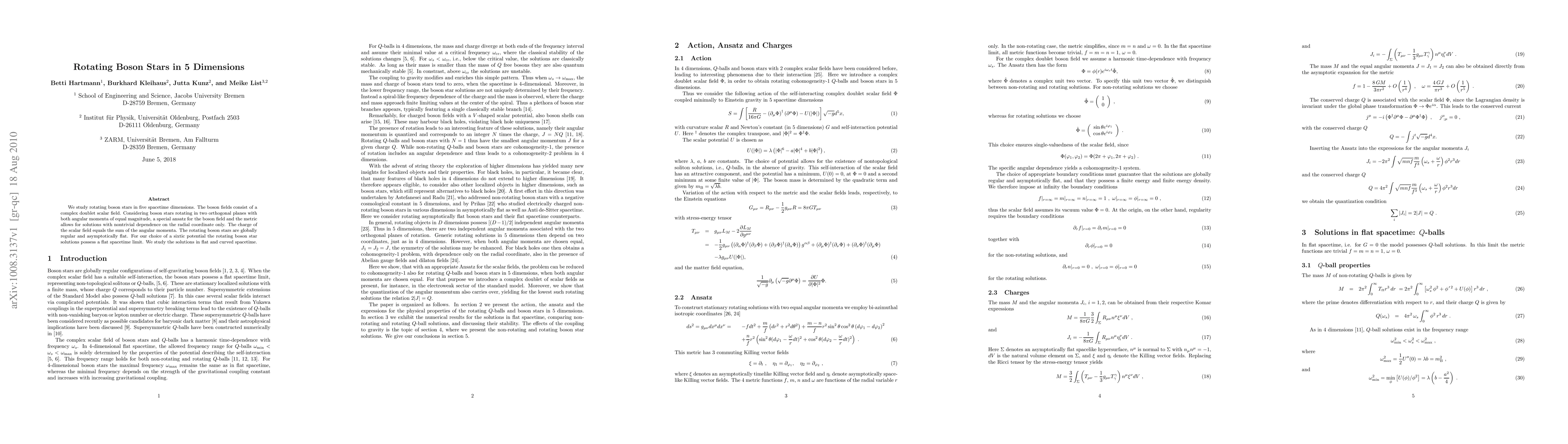 We study rotating boson stars in five spacetime dimensions. The boson fields consist of a complex doublet scalar field. Considering boson stars rotating in two orthogonal planes with both angular momenta of equal magnitude, a special ansatz for the boson field and the metric allows for solutions with nontrivial dependence on the radial coordinate only. The charge of the scalar field equals the sum of the angular momenta. The rotating boson stars are globally regular and asymptotically flat. For our choice of a sixtic potential the rotating boson star solutions possess a flat spacetime limit. We study the solutions in flat and curved spacetime.