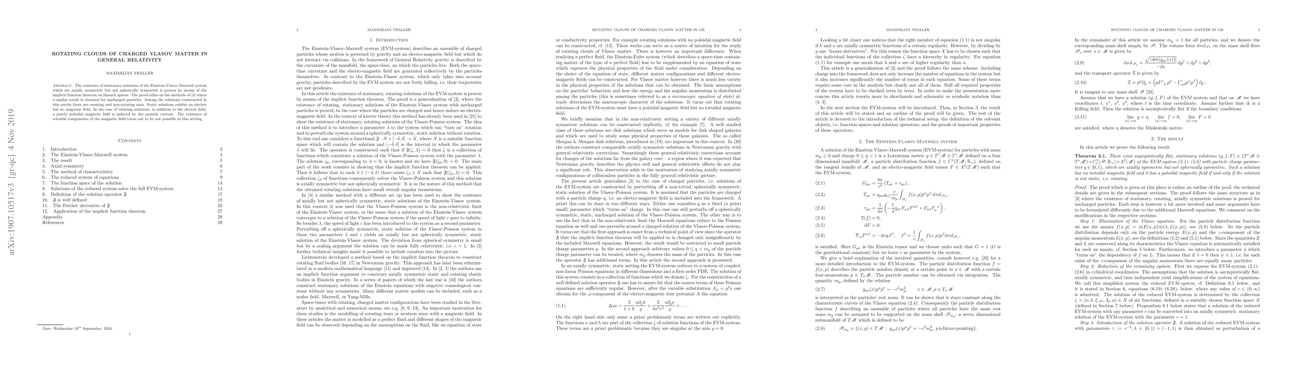 The existence of stationary solutions of the Einstein-Vlasov-Maxwell system which are axially symmetric but not spherically symmetric is proven by means of the implicit function theorem on Banach spaces. The proof generalises the methods of an article by H{\aa}kan Andr\'easson, Markus Kunze and Gerhard Rein where a similar result is obtained for uncharged particles. Among the solutions constructed in this article there are rotating and non-rotating ones. Static solutions exhibit an electric but no magnetic field. In the case of rotating solutions, in addition to the electric field, a purely poloidal magnetic field is induced by the particle current. The existence of toroidal components of the magnetic field turns out to be not possible in this setting.