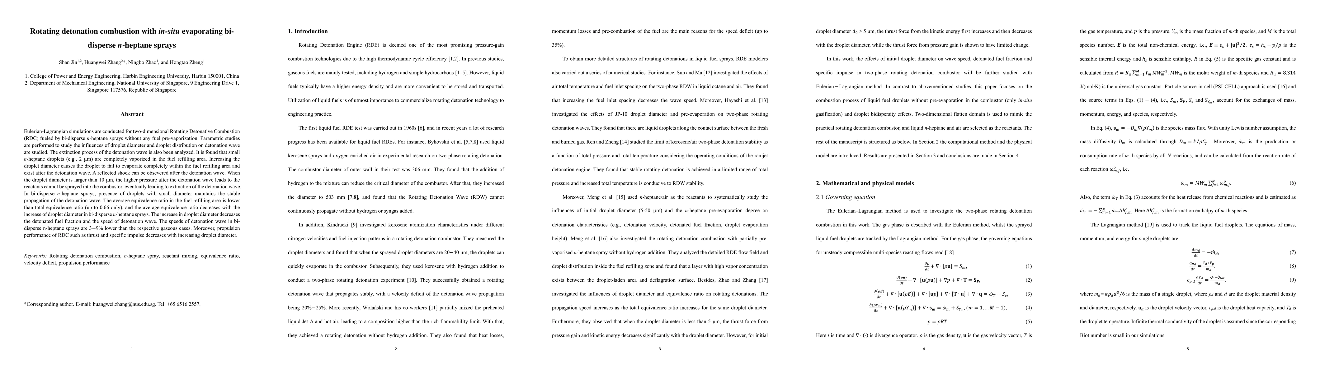 This paper investigates the effects of bi-disperse n-heptane sprays on rotating detonation combustion (RDC) through Eulerian-Lagrangian simulations. Small droplets (e.g., 2 μm) vaporize fully, while larger droplets (over 10 μm) lead to detonation wave extinction due to insufficient reactant spraying.