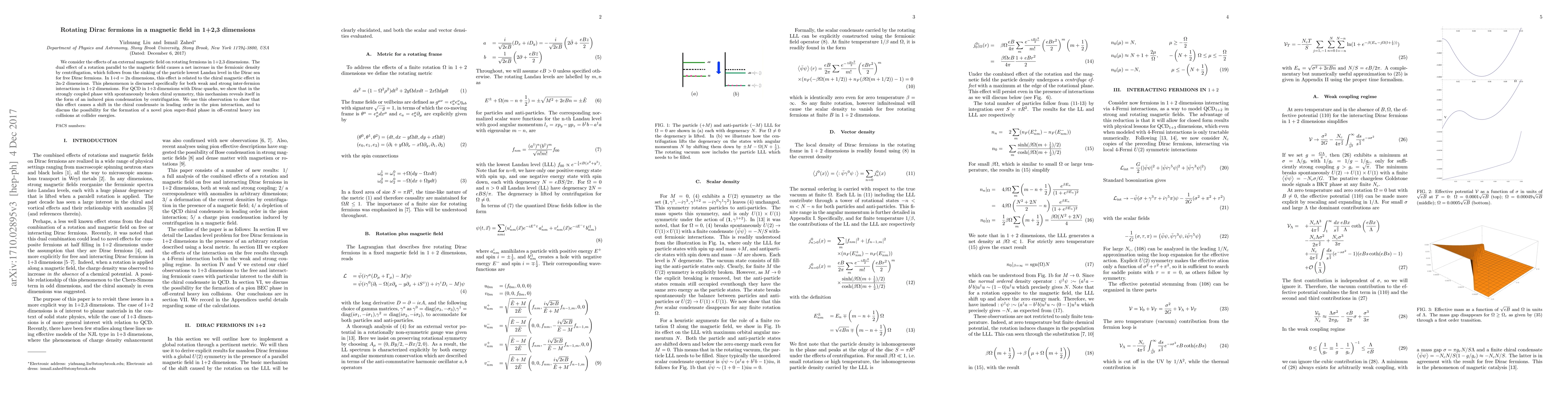 Researchers explore how a magnetic field affects rotating fermions in 1+2,3 dimensions, leading to increased density through centrifugation, with implications for the formation of novel phases in heavy ion collisions.