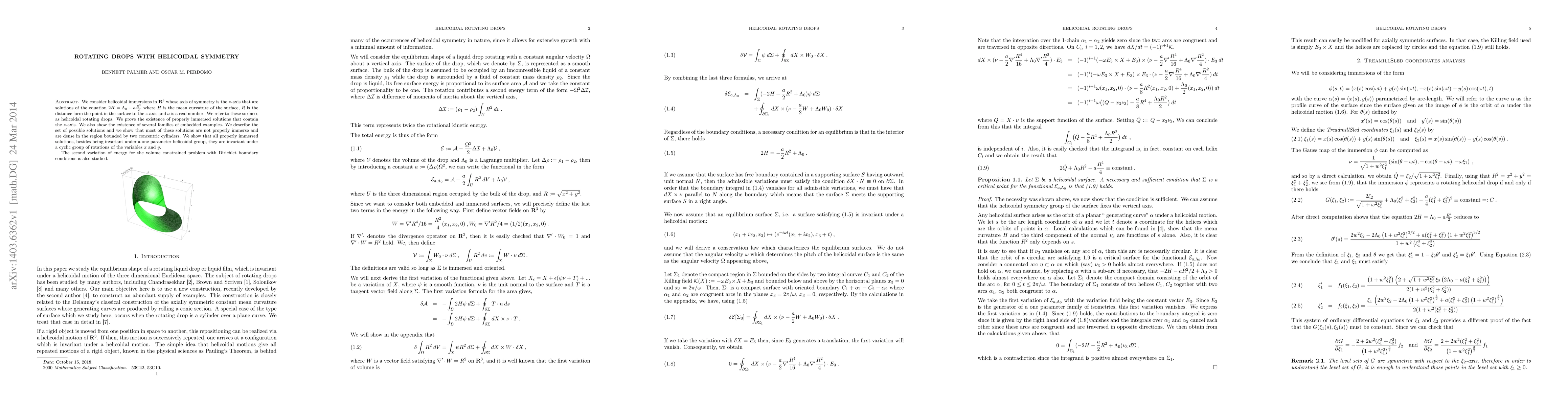 Researchers found that rotating drops with helicoidal symmetry exist in Euclidean space and exhibit properties like invariance under rotations and cyclic groups, with most solutions not being properly immersed but dense within a region bounded by concentric cylinders.
