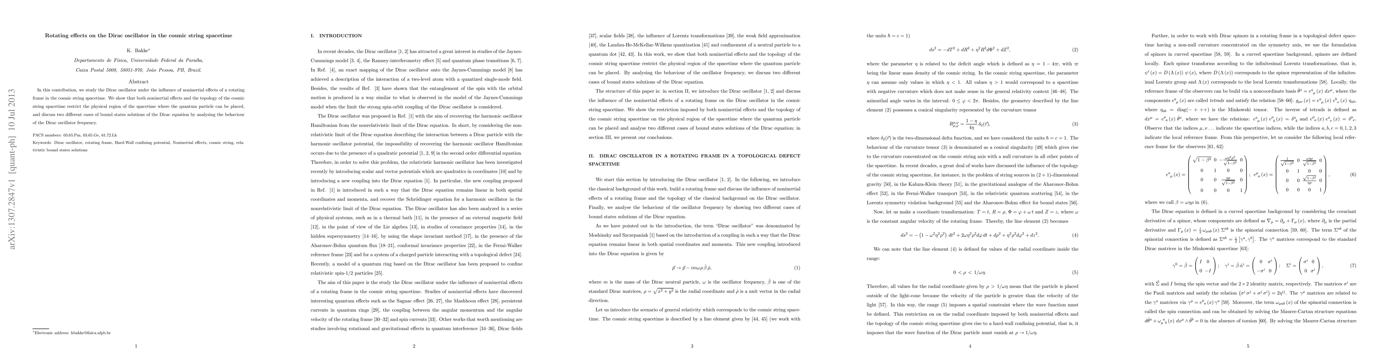 In this contribution, we study the Dirac oscillator under the influence of noninertial effects of a rotating frame in the cosmic string spacetime. We show that both noninertial effects and the topology of the cosmic string spacetime restrict the physical region of the spacetime where the quantum particle can be placed, and discuss two different cases of bound states solutions of the Dirac equation by analysing the behaviour of the Dirac oscillator frequency.
