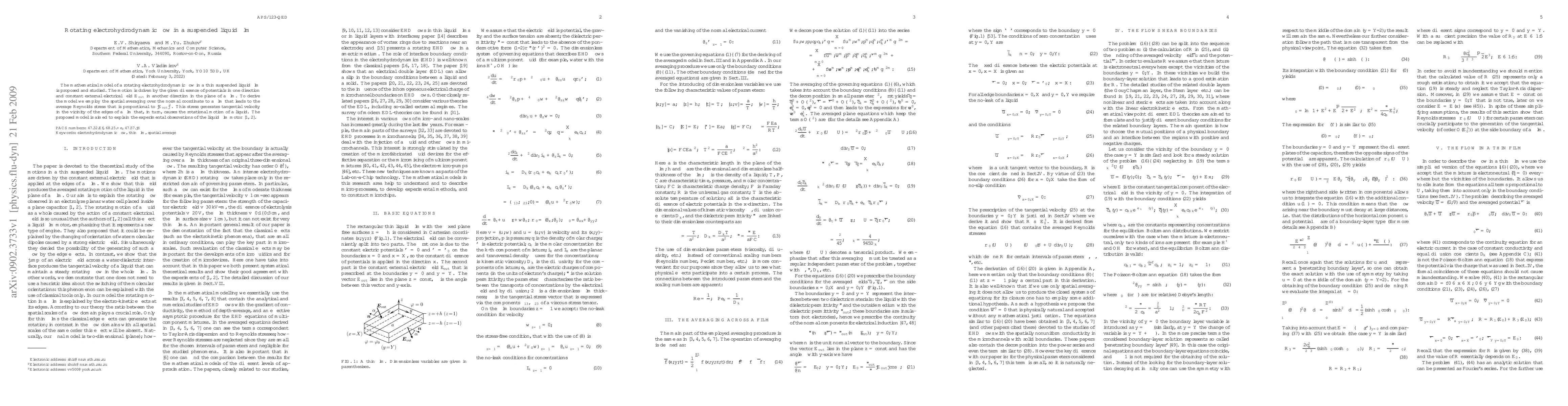 This paper proposes a mathematical model for rotating electrohydrodynamic flow in a thin suspended liquid film, driven by potential differences and an external electric field. The model employs spatial averaging to derive an average Reynolds stress proportional to $|\vE_\text{out}|^3$, explaining the observed rotational motion in a liquid film motor.
