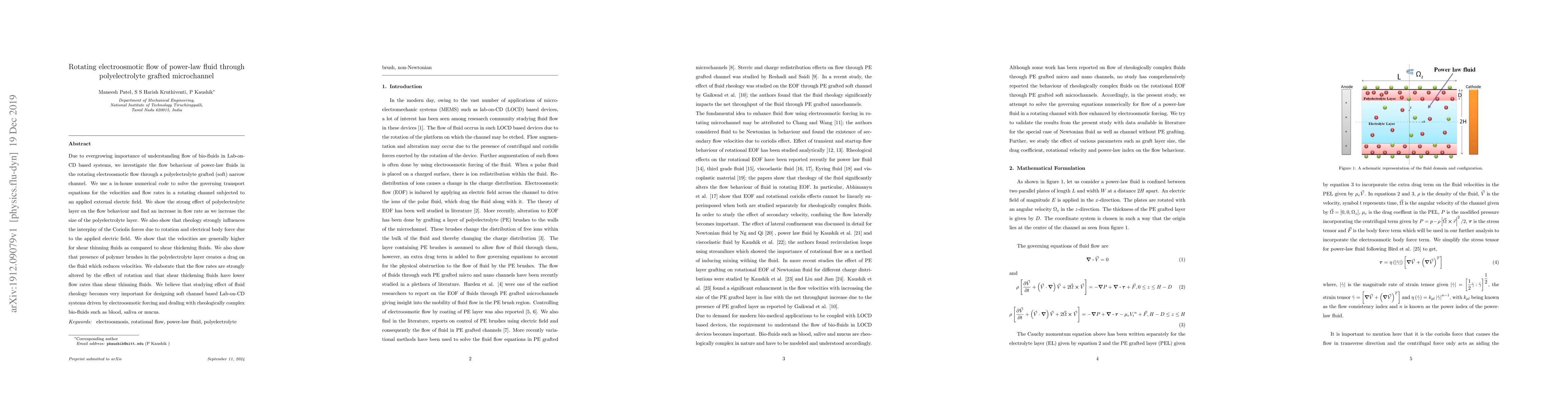 This study investigates the rotating electroosmotic flow of power-law fluids in polyelectrolyte-grafted microchannels, revealing that the size of the polyelectrolyte layer and fluid rheology significantly influence flow rates and velocities, with shear thinning fluids exhibiting higher velocities and altered flow rates due to rotation.