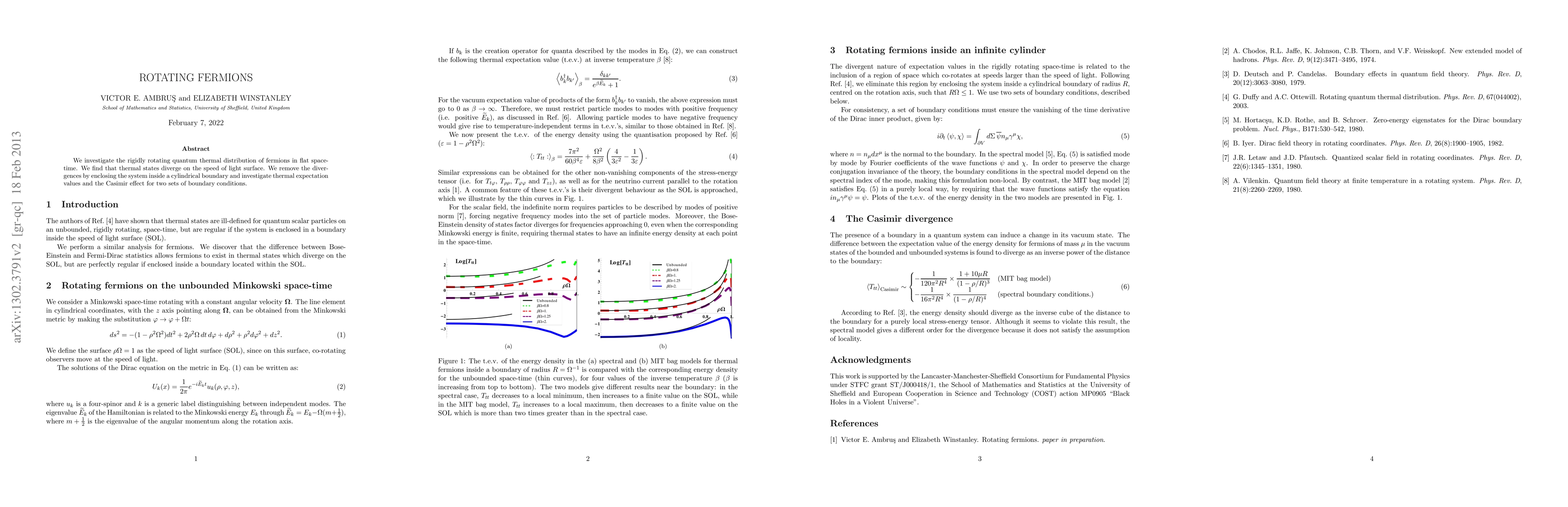 This paper explores the quantum thermal distribution of rigidly rotating fermions in flat space-time, discovering divergences at the speed of light surface. To resolve these, the authors enclose the system within a cylindrical boundary and analyze thermal expectation values and the Casimir effect under different boundary conditions.