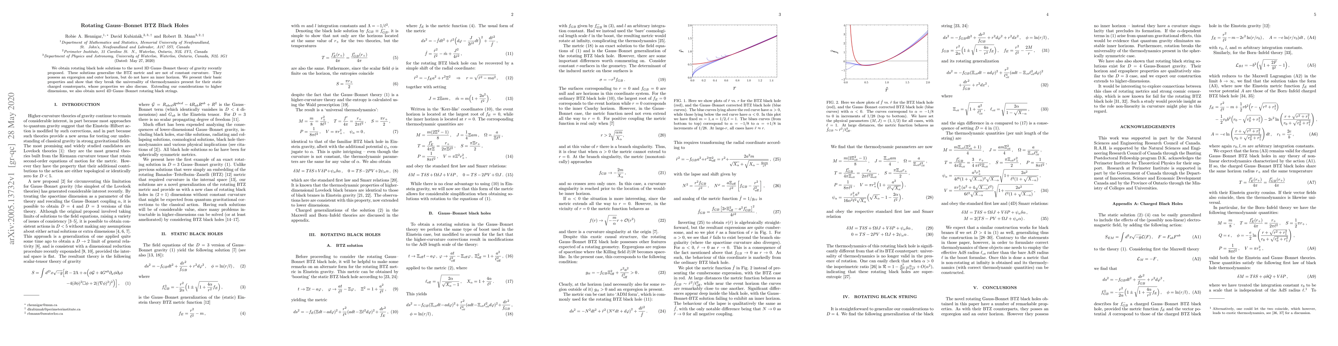 The paper presents rotating black hole solutions in a 3D Gauss-Bonnet gravity theory, extending the BTZ metric with ergoregions and outer horizions but no inner horizons. These solutions break the thermodynamic universality of static charged counterparts. The research also introduces novel 4D Gauss-Bonnet rotating black strings, highlighting non-constant curvature properties and deviations from standard thermodynamics.