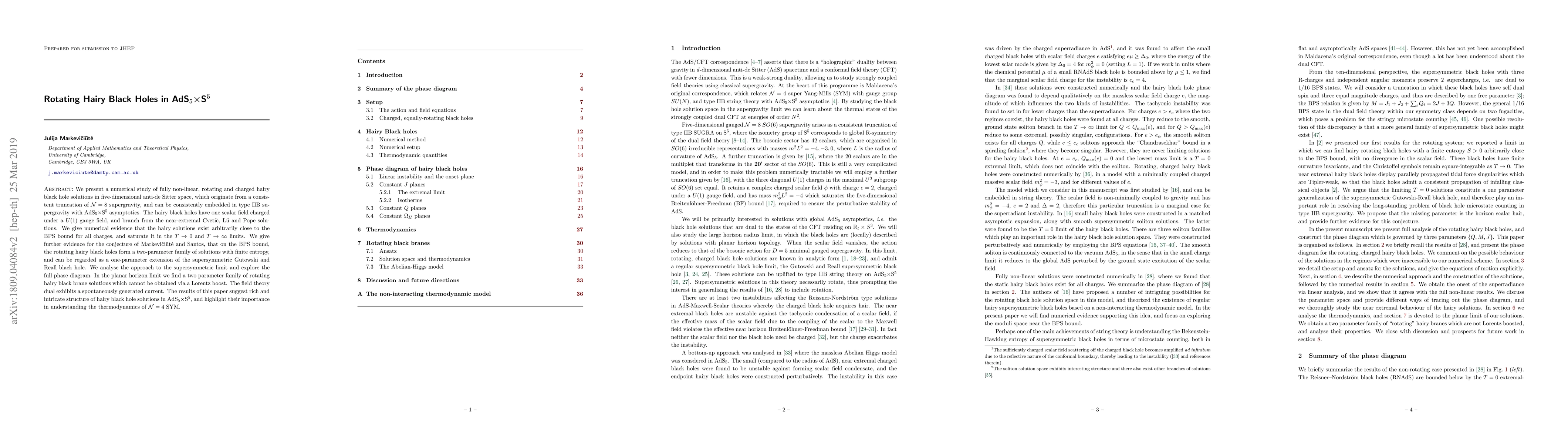 We present a numerical study of fully non-linear, rotating and charged hairy black hole solutions in five-dimensional anti-de Sitter space, which originate from a consistent truncation of $\mathcal{N}=8$ supergravity, and can be consistently embedded in type IIB supergravity with AdS$_5\times$S$^5$ asymptotics. The hairy black holes have one scalar field charged under a $U(1)$ gauge field, and branch from the near-extremal Cveti\v{c}, L\"{u} and Pope solutions. We give numerical evidence that the hairy solutions exist arbitrarily close to the BPS bound for all charges, and saturate it in the $T\rightarrow 0$ and $T\rightarrow\infty$ limits. We give further evidence for the conjecture of Markevi\v{c}i\={u}t\.e and Santos, that on the BPS bound, the rotating hairy black holes form a two-parameter family of solutions with finite entropy, and can be regarded as a one-parameter extension of the supersymmetric Gutowski and Reall black hole. We analyse the approach to the supersymmetric limit and explore the full phase diagram. In the planar horizon limit we find a two parameter family of rotating hairy black brane solutions which cannot be obtained via a Lorentz boost. The field theory dual exhibits a spontaneously generated current. The results of this paper suggest rich and intricate structure of hairy black hole solutions in AdS$_5\times$S$^5$, and highlight their importance in understanding the thermodynamics of $\mathcal{N}=4$ SYM.