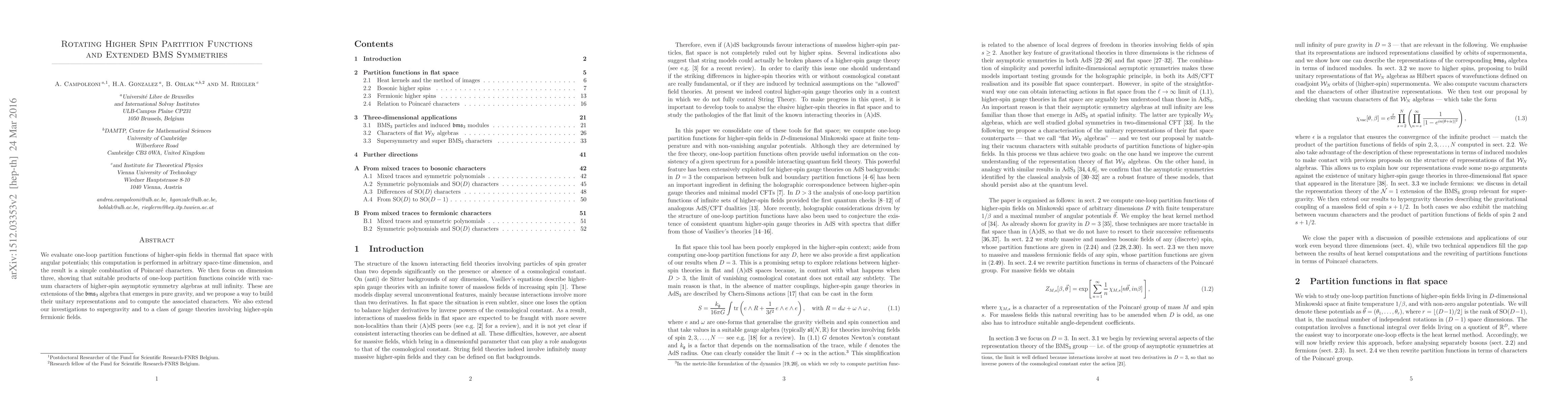 This paper evaluates one-loop partition functions for higher-spin fields in thermal flat space, revealing a connection to extended BMS symmetries in three dimensions. It proposes a method for constructing unitary representations of these extended algebras and extends the findings to supergravity and higher-spin gauge theories.