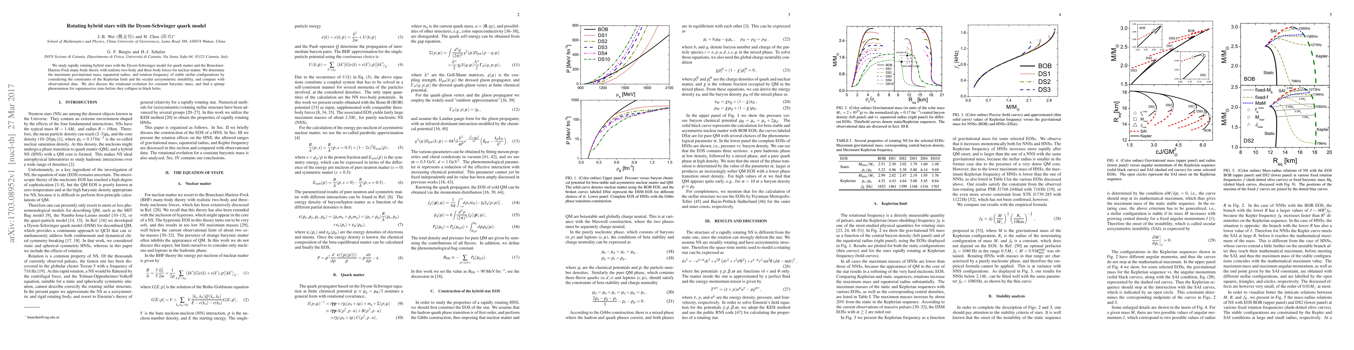 This paper investigates the properties of rapidly rotating hybrid stars using the Dyson-Schwinger quark model and Brueckner-Hartree-Fock theory, determining their maximum mass, radius, and rotation frequency while considering stability limits and comparing results to observations. It also reveals a spinup phenomenon in supramassive stars before they collapse into black holes.