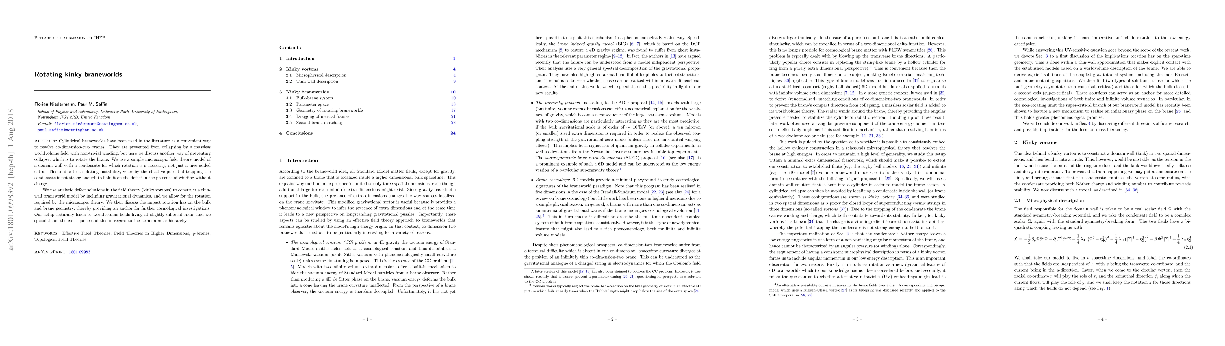 Cylindrical braneworlds have been used in the literature as a convenient way to resolve co-dimension-two branes. They are prevented from collapsing by a massless worldvolume field with non-trivial winding, but here we discuss another way of preventing collapse, which is to rotate the brane. We use a simple microscopic field theory model of a domain wall with a condensate for which rotation is a necessity, not just a nice added extra. This is due to a splitting instability, whereby the effective potential trapping the condensate is not strong enough to hold it on the defect in the presence of winding without charge. We use analytic defect solutions in the field theory (kinky vortons) to construct a thin-wall braneworld model by including gravitational dynamics, and we allow for the rotation required by the microscopic theory. We then discuss the impact rotation has on the bulk and brane geometry, thereby providing an anchor for further cosmological investigations. Our setup naturally leads to worldvolume fields living at slightly different radii, and we speculate on the consequences of this in regard to the fermion mass-hierarchy.