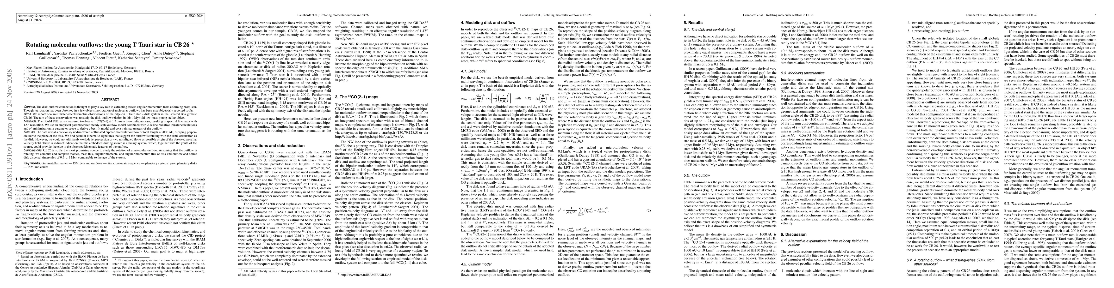 The disk-outflow connection is thought to play a key role in extracting excess angular momentum from a forming proto-star. Though jet rotation has been observed in a few objects, no rotation of molecular outflows has been unambiguously reported so far. We report new millimeter-interferometric observations of the edge-on T Tauri star - disk system in the isolated Bok globule CB26. The aim of these observations was to study the disk-outflow relation in this 1Myr old low-mass young stellar object. The IRAM PdBI array was used to observe 12CO(2-1) at 1.3mm in two configurations, resulting in spectral line maps with 1.5 arcsec resolution. We use an empirical parameterized steady-state outflow model combined with 2-D line radiative transfer calculations and chi^2-minimization in parameter space to derive a best-fit model and constrain parameters of the outflow. The data reveal a previously undiscovered collimated bipolar molecular outflow of total length ~2000 AU, escaping perpendicular to the plane of the disk. We find peculiar kinematic signatures that suggest the outflow is rotating with the same orientation as the disk. However, we could not ultimately exclude jet precession or two misaligned flows as possible origin of the observed peculiar velocity field. There is indirect indication that the embedded driving source is a binary system, which, together with the youth of the source, could provide the clue to the observed kinematic features of the outflow. CB26 is so far the most promising source to study the rotation of a molecular outflow. Assuming that the outflow is rotating, we compute and compare masses, mass flux, angular momenta, and angular momentum flux of disk and outflow and derive disk dispersal timescales of 0.5...1 Myr, comparable to the age of the system.