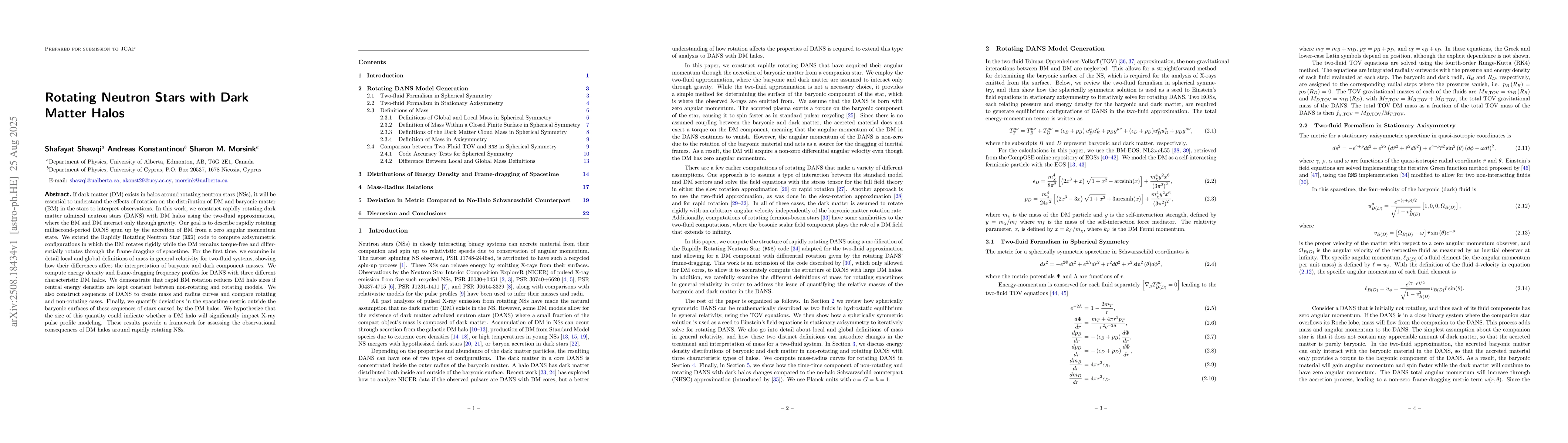If dark matter (DM) exists in halos around rotating neutron stars (NSs), it will be essential to understand the effects of rotation on the distribution of DM and baryonic matter (BM) in the stars to interpret observations. In this work, we construct rapidly rotating dark matter admixed neutron stars (DANS) with DM halos using the two-fluid approximation, where the BM and DM interact only through gravity. Our goal is to describe rapidly rotating millisecond-period DANS spun up by the accretion of BM from a zero angular momentum state. We extend the Rapidly Rotating Neutron Star (RNS) code to compute axisymmetric configurations in which the BM rotates rigidly while the DM remains torque-free and differentially rotates through the frame-dragging of spacetime. For the first time, we examine in detail local and global definitions of mass in general relativity for two-fluid systems, showing how their differences affect the interpretation of baryonic and dark component masses. We compute energy density and frame-dragging frequency profiles for DANS with three different characteristic DM halos. We demonstrate that rapid BM rotation reduces DM halo sizes if central energy densities are kept constant between non-rotating and rotating models. We also construct sequences of DANS to create mass and radius curves and compare rotating and non-rotating cases. Finally, we quantify deviations in the spacetime metric outside the baryonic surfaces of these sequences of stars caused by the DM halos. We hypothesize that the size of this quantity could indicate whether a DM halo will significantly impact X-ray pulse profile modeling. These results provide a framework for assessing the observational consequences of DM halos around rapidly rotating NSs.