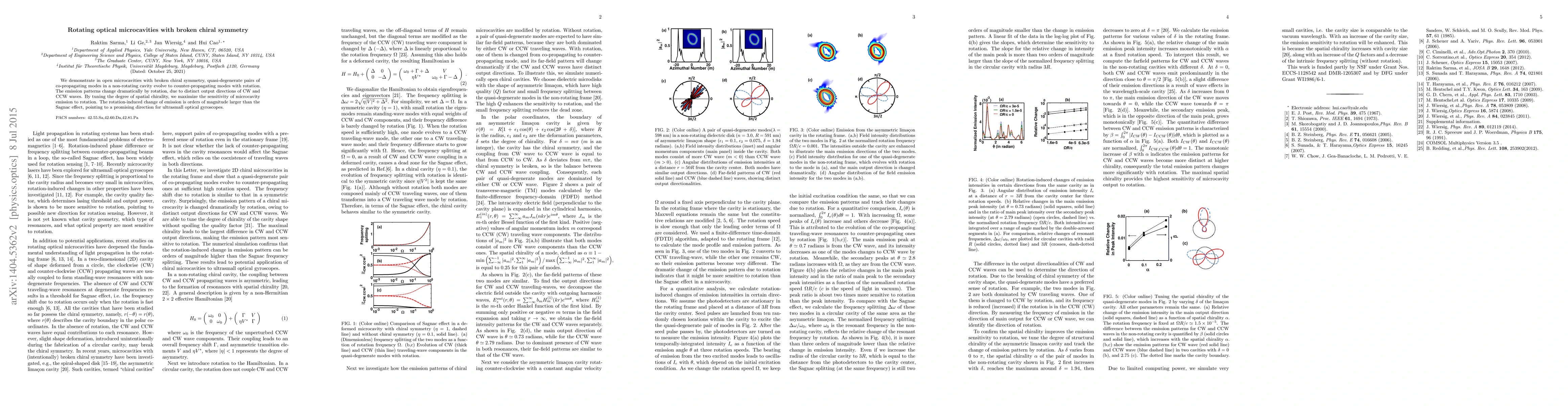 This paper demonstrates that rotating optical microcavities with broken chiral symmetry can transform quasi-degenerate co-propagating modes into counter-propagating ones, significantly altering emission patterns. The study shows a large rotation-induced change in emission, much greater than the Sagnac effect, suggesting potential for ultrasmall optical gyroscopes.