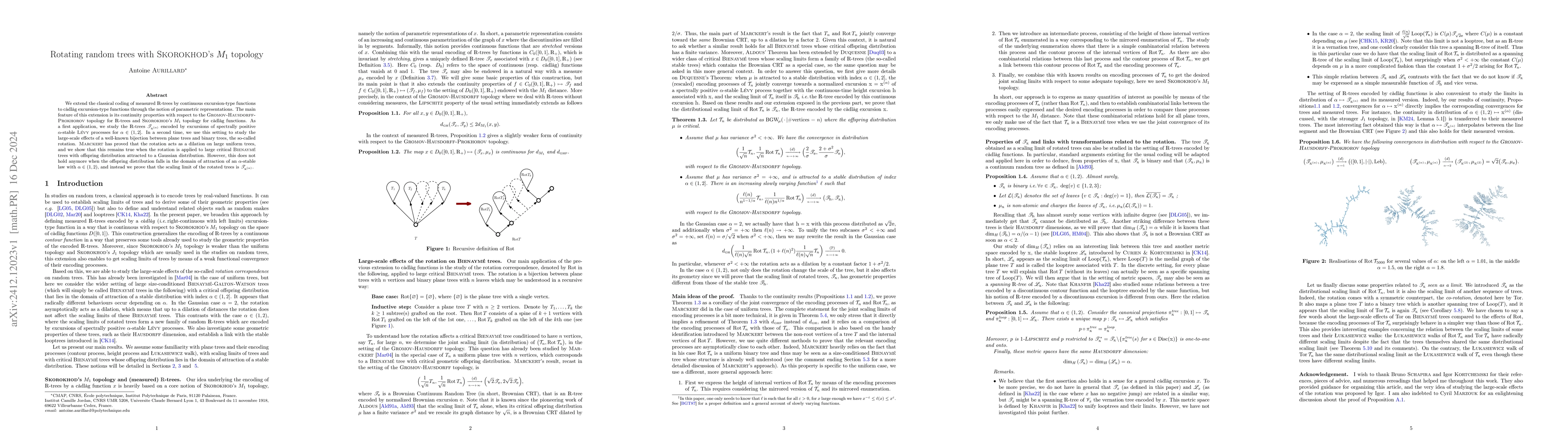 This paper extends the classical coding of measured $\mathbb{R}$-trees using continuous functions to càdlàg functions, preserving continuity properties under Skorokhod's $M_1$ topology. It applies this framework to study rotations in large-scale $\mathbb{R}$-trees, revealing that rotations maintain dilation properties for Gaussian-distributed Bienaymé trees but lead to $\mathcal{T}_{x^{(\alpha)}}$ scaling limits for $\alpha$-stable distributions.
