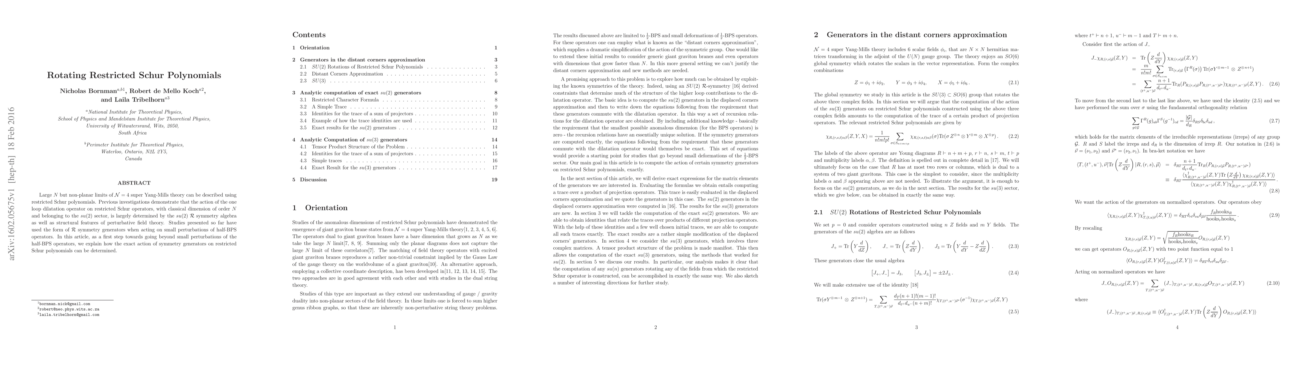 Large $N$ but non-planar limits of ${\cal N}=4$ super Yang-Mills theory can be described using restricted Schur polynomials. Previous investigations demonstrate that the action of the one loop dilatation operator on restricted Schur operators, with classical dimension of order $N$ and belonging to the $su(2)$ sector, is largely determined by the $su(2)$ ${\cal R}$ symmetry algebra as well as structural features of perturbative field theory. Studies presented so far have used the form of ${\cal R}$ symmetry generators when acting on small perturbations of half-BPS operators. In this article, as a first step towards going beyond small perturbations of the half-BPS operators, we explain how the exact action of symmetry generators on restricted Schur polynomials can be determined.