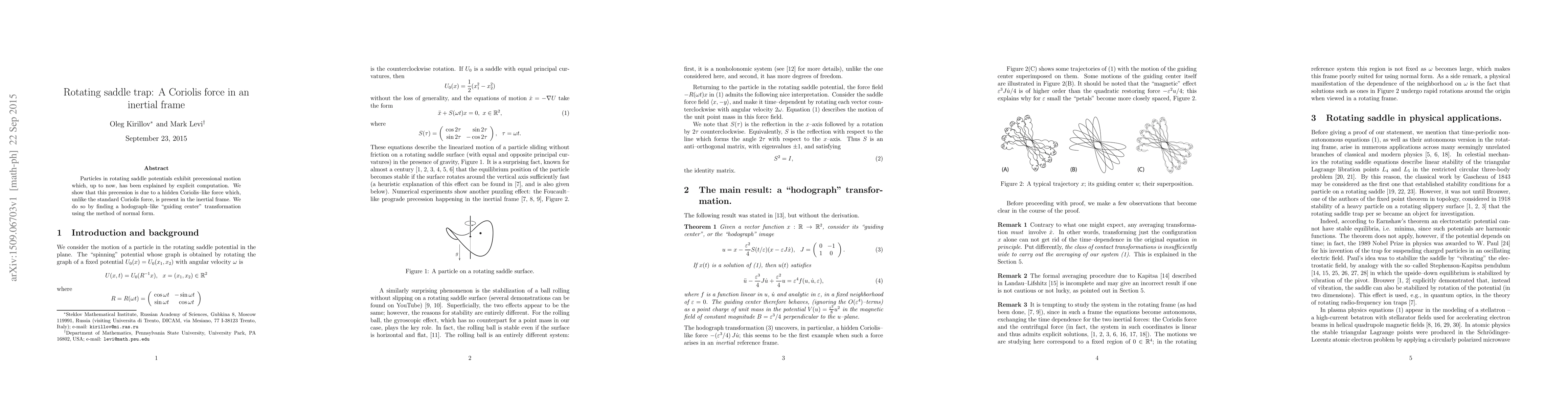 This paper reveals a hidden Coriolis-like force in inertial frames causing precessional motion in particles within rotating saddle potentials, previously explained through explicit computation. The authors demonstrate this effect using a hodograph-like "guiding center" transformation via the method of normal form.