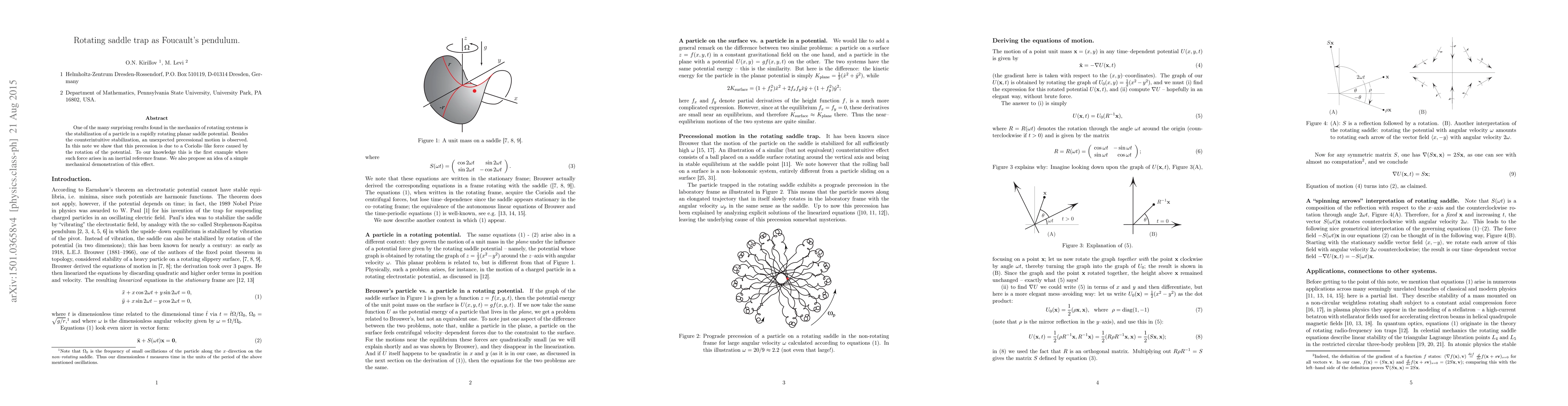 This paper explores the stabilization and precessional motion of a particle in a rapidly rotating saddle potential, attributing the observed precession to a Coriolis-like force in an inertial frame, and suggests a mechanical demonstration of this phenomenon.