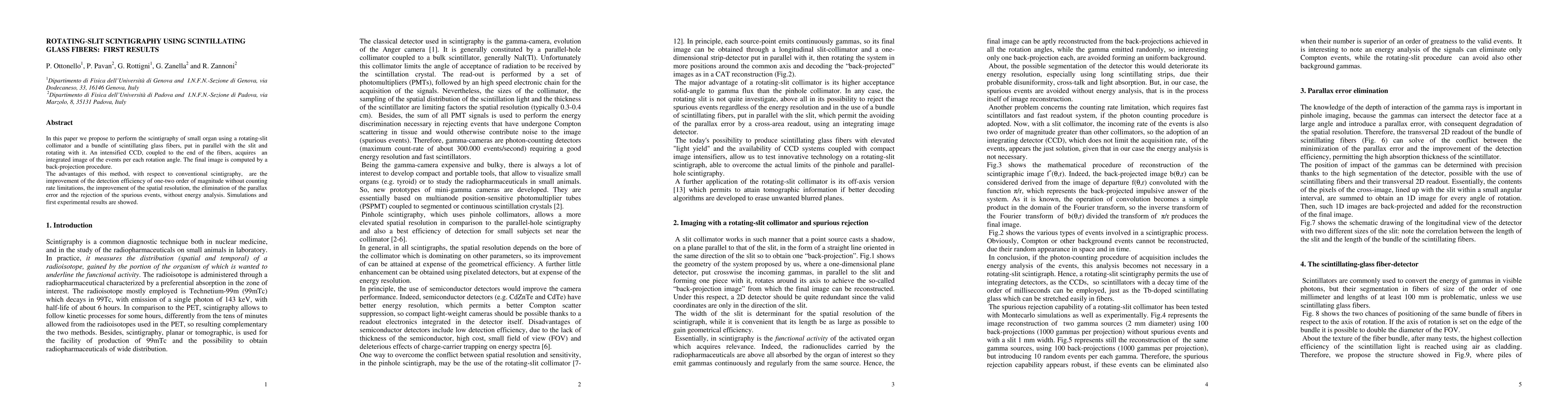 In this paper we propose to perform the scintigraphy of small organ using a rotating-slit collimator and a bundle of scintillating glass fibers, put in parallel with the slit and rotating with it. An intensified CCD, coupled to the end of the fibers, acquires an integrated image of the events per each rotation angle. The final image is computed by a back-projection procedure. The advantages of this method, with respect to conventional scintigraphy, are the improvement of the detection efficiency of one-two order of magnitude without counting rate limitations, the improvement of the spatial resolution, the elimination of the parallax error and the rejection of the spurious events, without energy analysis. Simulations and first experimental results are showed.