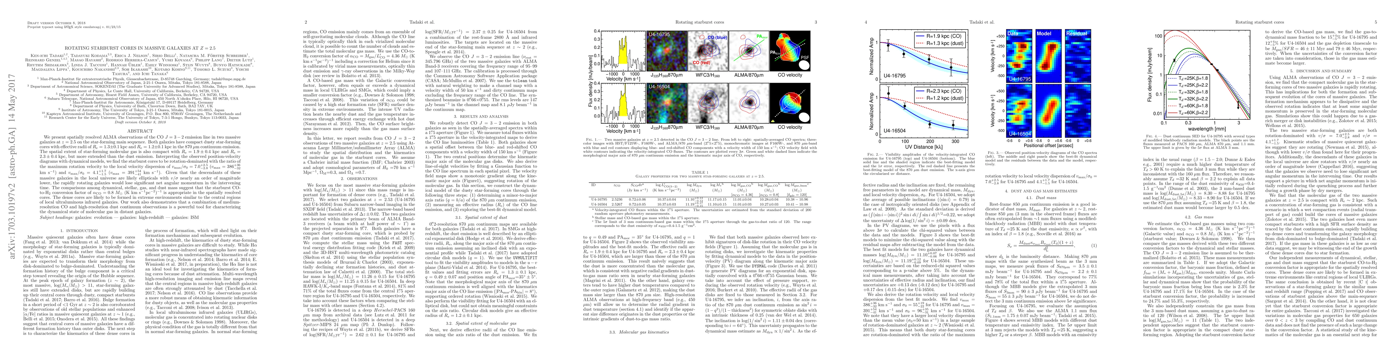 This paper presents ALMA observations revealing compact, rotating starburst cores in two massive galaxies at z=2.5, showing significant rotation with high angular momentum, suggesting they may lose angular momentum over time, unlike their likely elliptical descendants in the local universe. The study also finds an appropriate CO-to-H2 conversion factor for these dense cores.