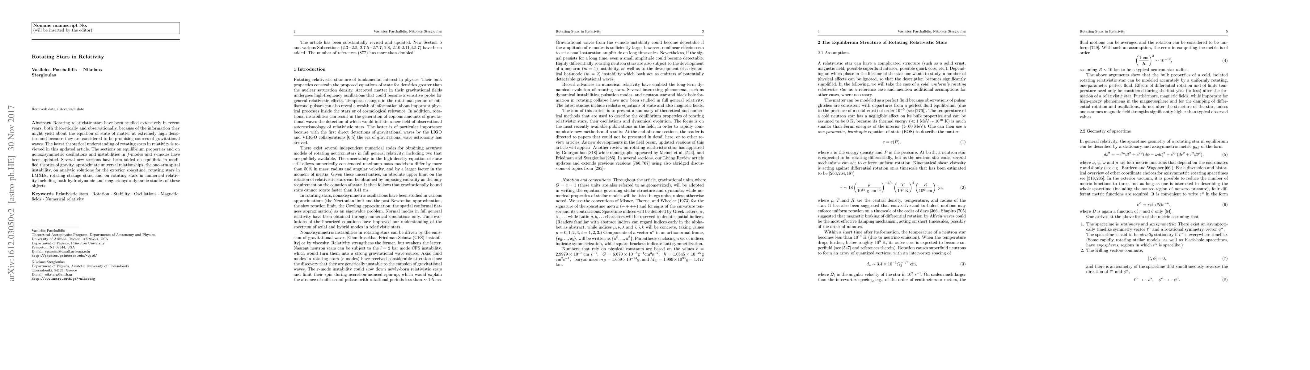 This paper reviews the latest theoretical understanding of rotating relativistic stars, focusing on their equilibrium properties, oscillations, and instabilities. It also covers new developments in modified gravity, universal relationships, instabilities, analytic solutions, and numerical relativity studies, including their relevance in X-ray binaries and strange stars.