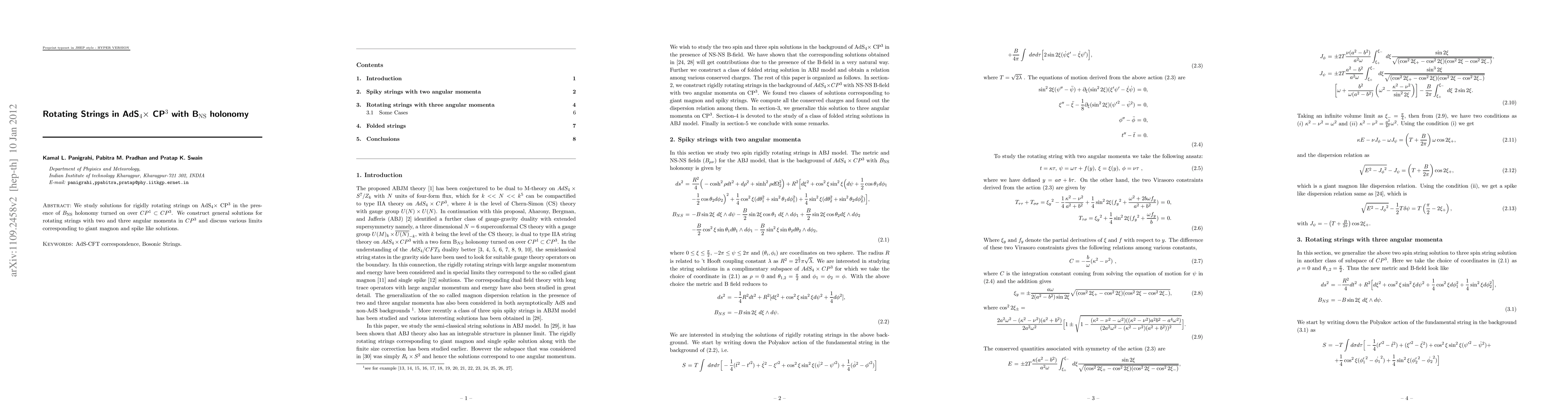 This paper constructs solutions for rotating strings in AdS$_4$ x CP$^3$ with NS-B field holonomy on CP$^1$. It examines cases with two and three angular momenta and discusses limits leading to giant magnon and spike solutions.