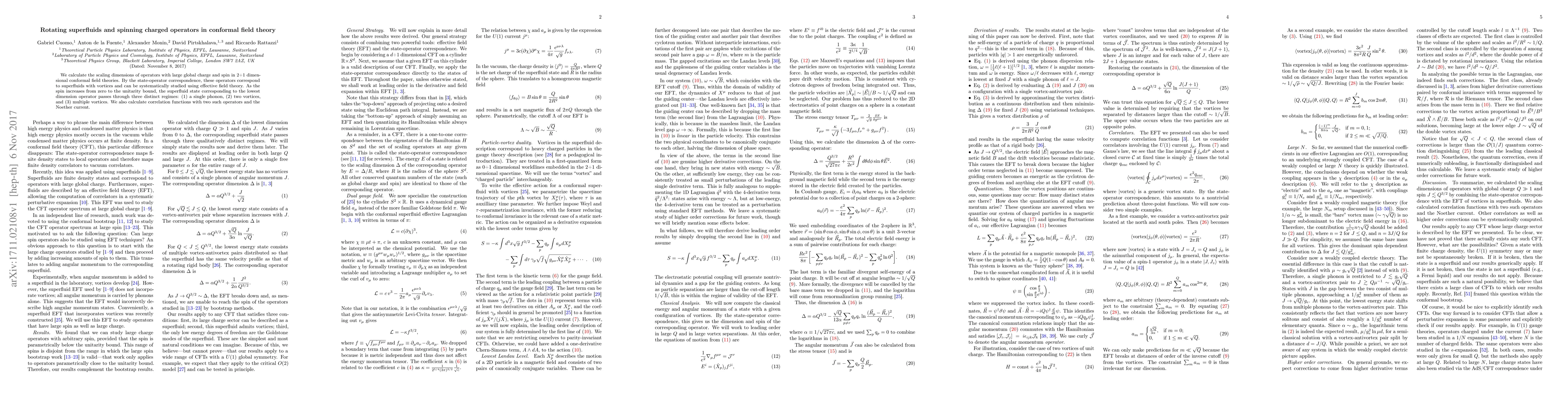 This paper investigates the scaling dimensions of high-spin, charged operators in conformal field theories, which correspond to rotating superfluids with vortices. It reveals three distinct regimes of superfluid states as spin increases, from a single phonon to multiple vortices, and computes correlation functions involving these operators and the Noether current.