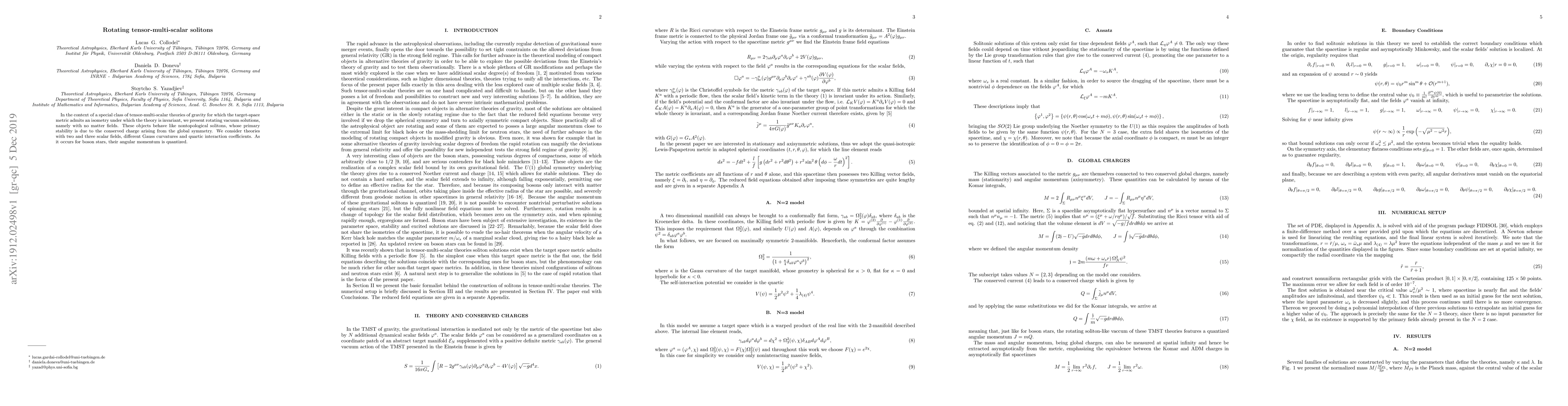 This paper explores rotating vacuum soliton solutions in tensor-multi-scalar gravity theories, demonstrating their stability through conserved charges and showing quantized angular momentum akin to boson stars. The study focuses on theories with two and three scalar fields and various interaction coefficients.