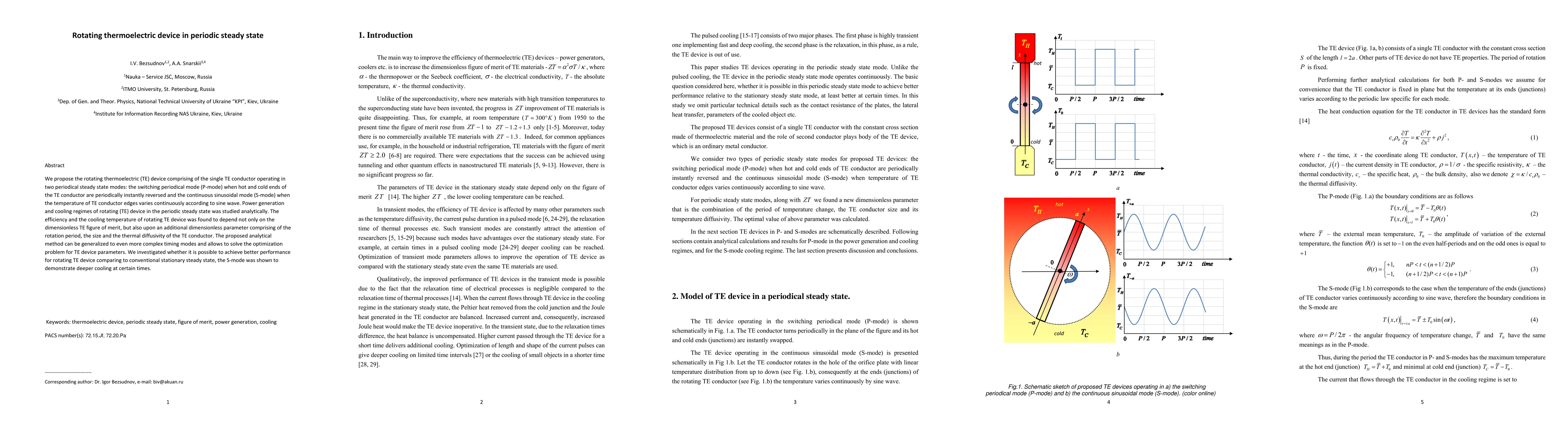 We propose the rotating thermoelectric (TE) device comprising of the single TE conductor operating in two periodical steady state modes: the switching periodical mode (P-mode) when hot and cold ends of the TE conductor are periodically instantly reversed and the continuous sinusoidal mode (S-mode) when the temperature of TE conductor edges varies continuously according to sine wave. Power generation and cooling regimes of rotating (TE) device in the periodic steady state was studied analytically. The efficiency and the cooling temperature of rotating TE device was found to depend not only on the dimensionless TE figure of merit, but also upon an additional dimensionless parameter comprising of the rotation period, the size and the thermal diffusivity of the TE conductor. The proposed analytical method can be generalized to even more complex timing modes and allows to solve the optimization problem for TE device parameters. We investigated whether it is possible to achieve better performance for rotating TE device comparing to conventional stationary steady state, the S-mode was shown to demonstrate deeper cooling at certain times.